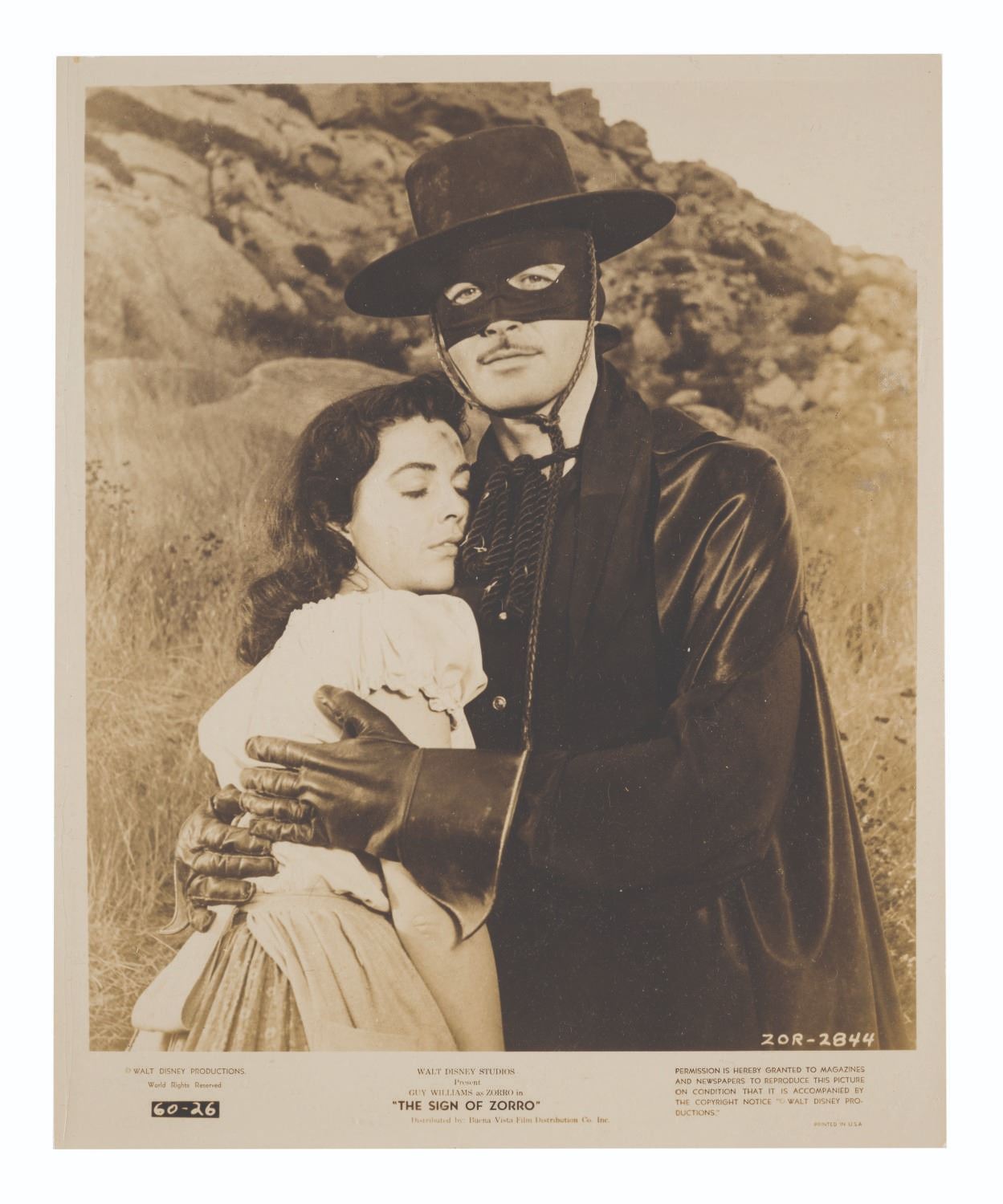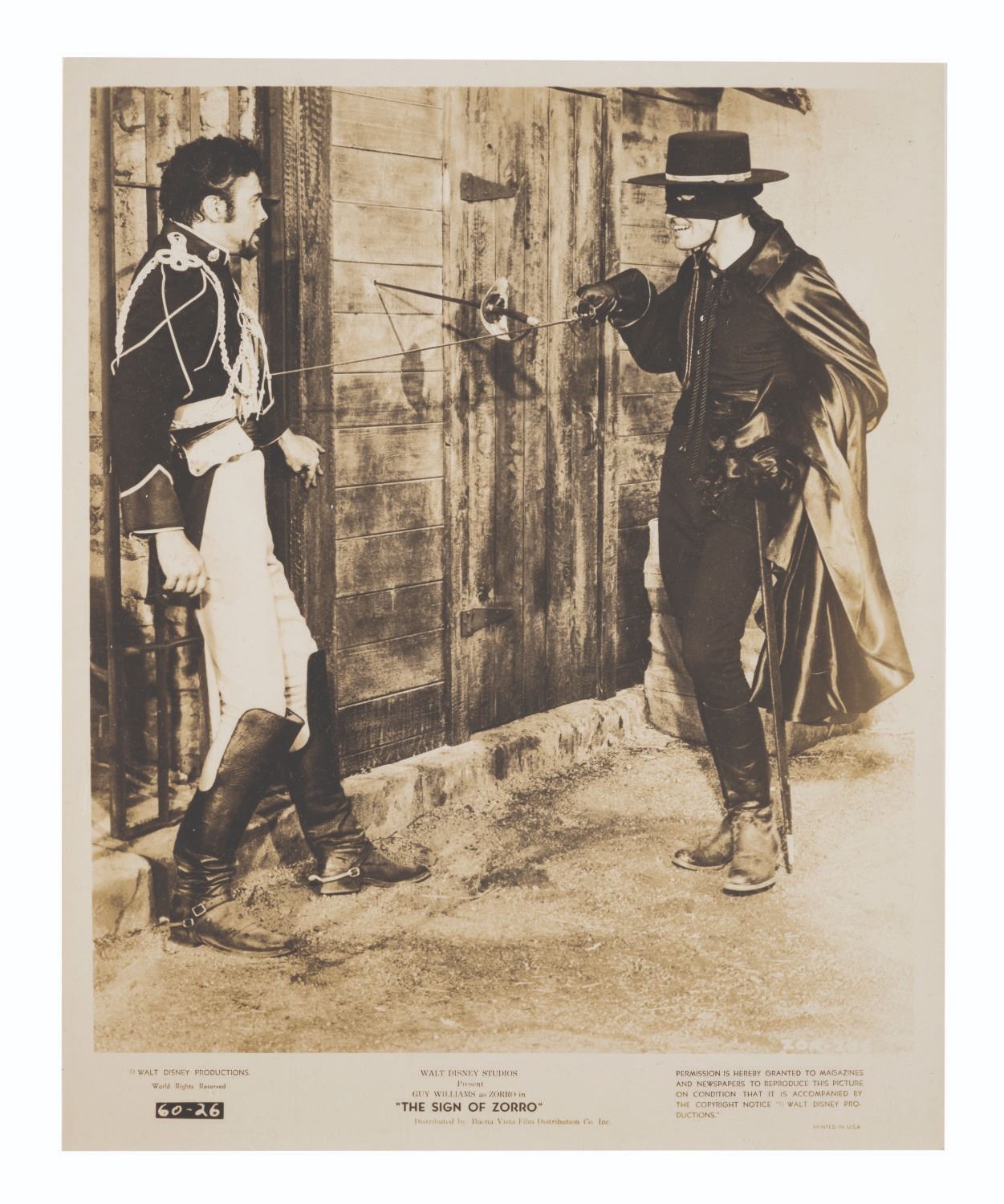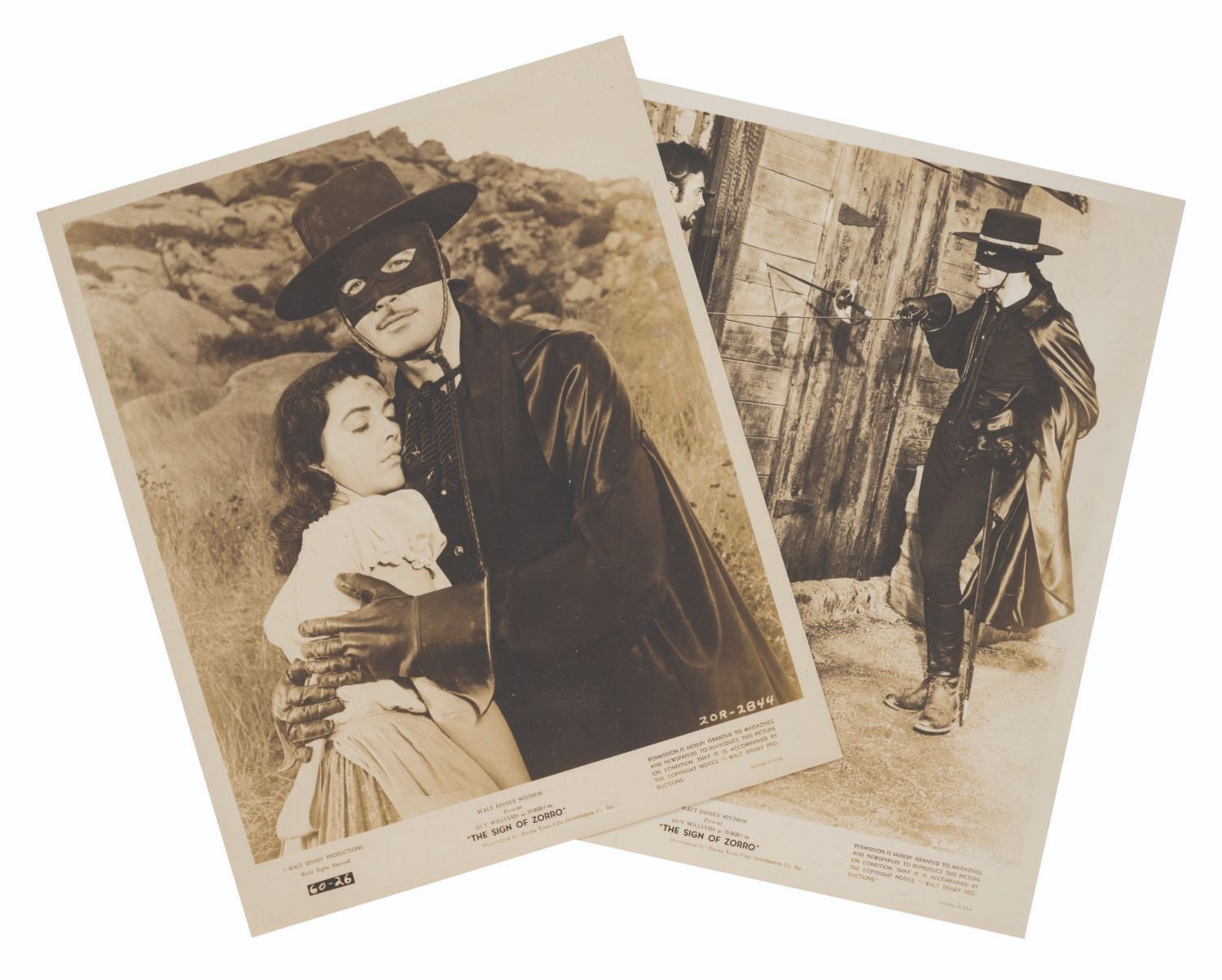 (Disney, 1958) Two publicity photos for "The Sign of Zorro,” a feature released internationally compiled from the popular Zorro television show. Measuring 8” x 10”, the photos are in good condition with light handling wear and color fade from age.