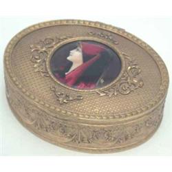 A Palais Royale gilt metal and enamel box, circa 1880, oval and embossed with bands of guilloche and applied with a Limoges enamel medallion of the head of a girl, 5ins wide £150-200