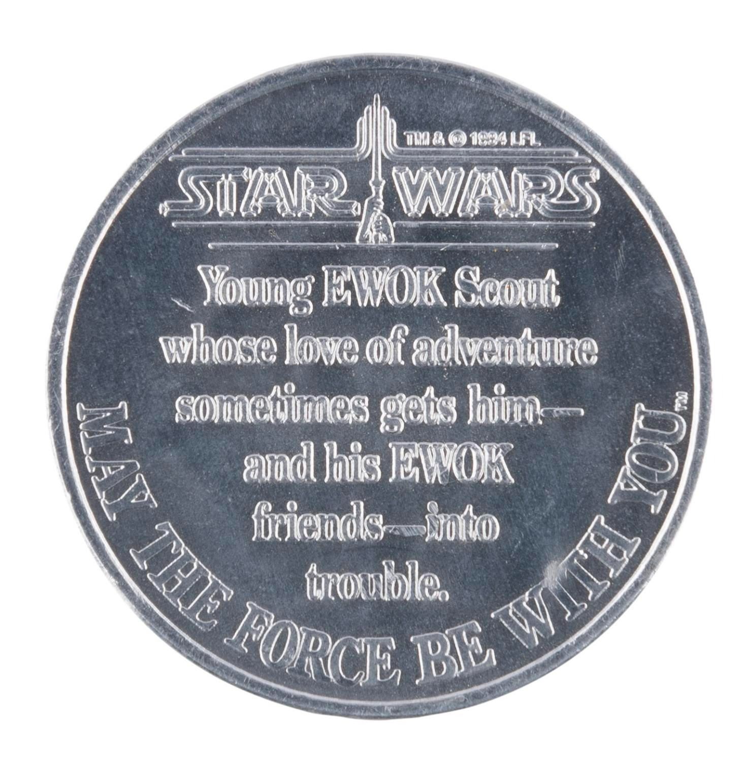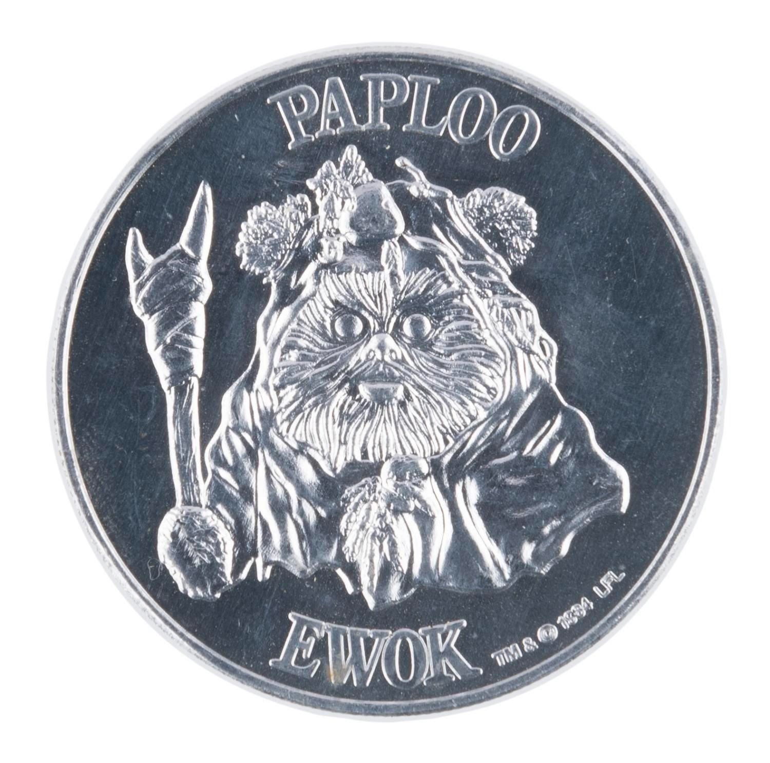 (Kenner, 1984) A Power of the Force Collector Coin of Paploo the Ewok from “Star Wars: Return of the Jedi.” Measuring 1.5” in diameter, the metal coin displays in very good condition with a light scuff.