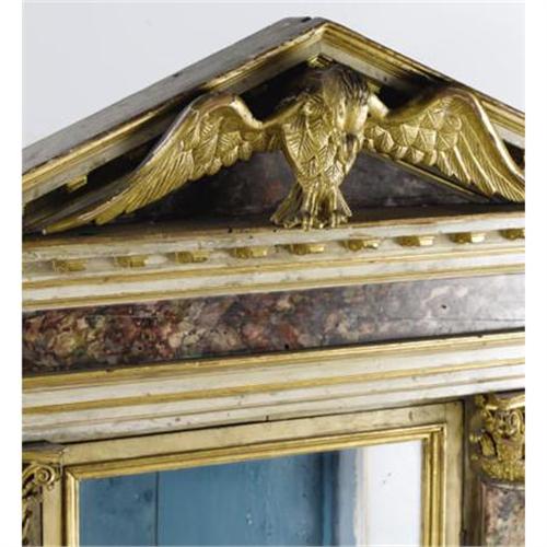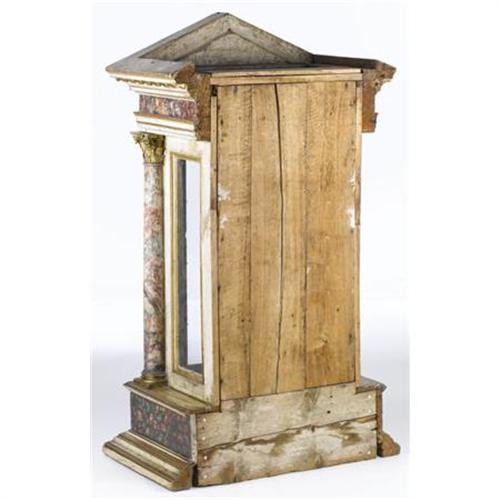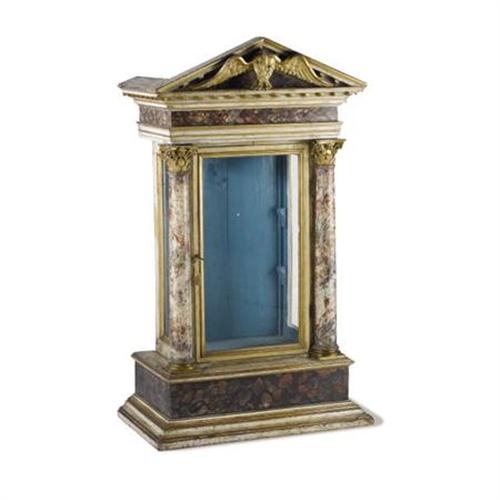 <B>A Parcel Gilt Reliquary</B></I><BR>Unknown maker<BR>Eighteenth Century<BR>The parcel-gilt and marbleized reliquary cabinet, the architectural pediment centered by a winged eagle above a glazed panel door flanked by marbleized Corinthian columns<BR>Unmarked<BR>51.2 inches high<BR><BR><b>Shipping:</b> Requires 3rd Party Shipping (<a target="_blank" href="http://www.heritageauctions.com/common/shipping.php">view shipping information</a>)