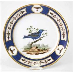 A Paris "Rue de Montmartre" plate attractively painted in colours with a Brazilian tree-creeper perched on a branch, growing from a rock, inscribed Grimpeau du Bresil, the blue rim decorated with shaped and gilt edged panels including vines and bowls in sepia, 9.25ins. "hulley" in iron-red, incised repairer's mark, early 19th century, minor rubbing. Provenance Sotheby's 24th February 1981 - Lot 136 £250-300