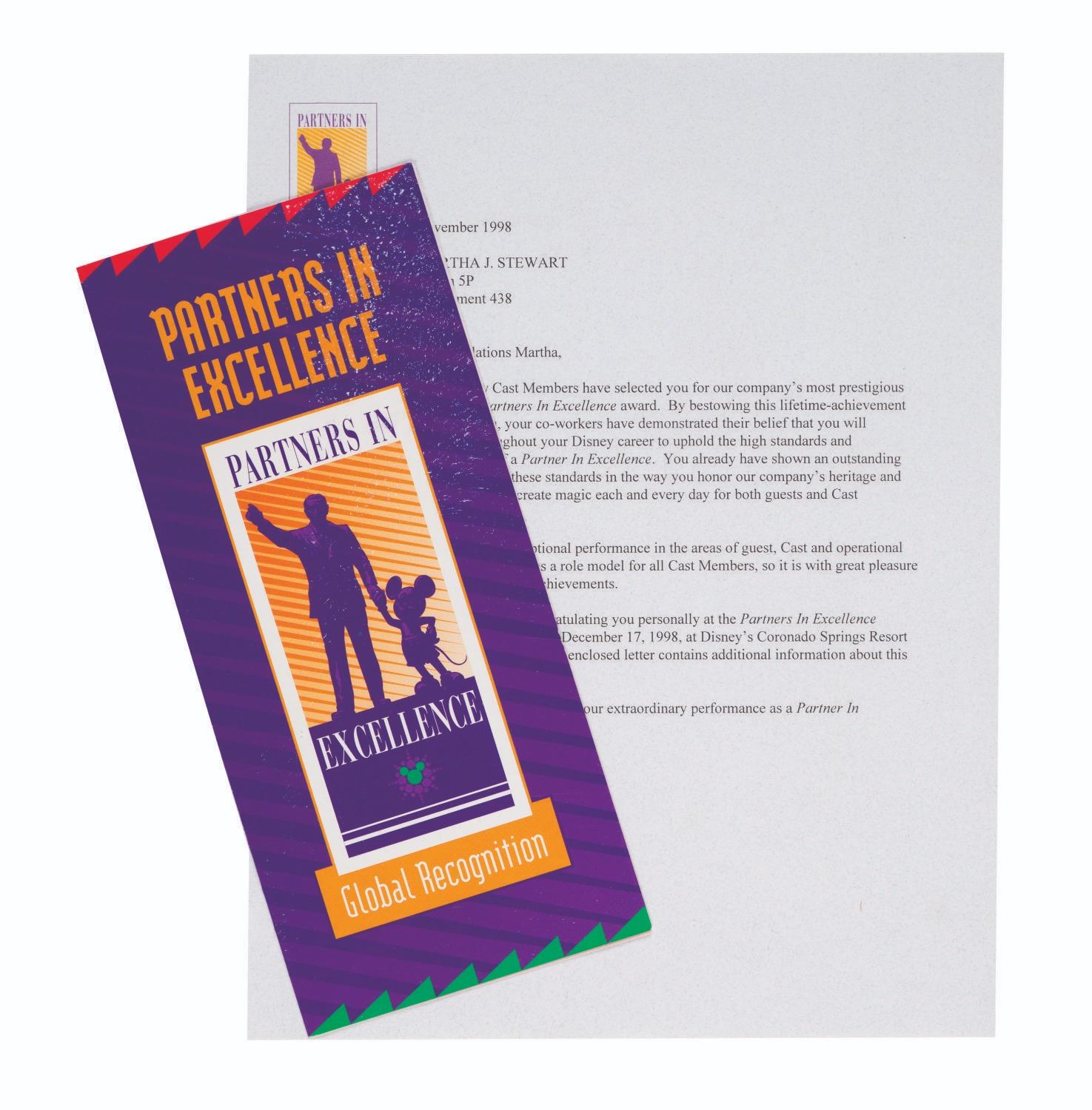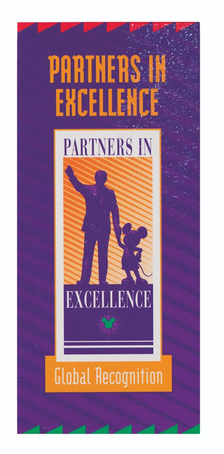 (Disney, 1998) A brochure and letter sent to a recipient of the Partners in Excellence Award. The distinguished lifetime-achievement award was developed to recognize and promote excellence in Cast Members. Measuring 9" x 4" and 8.5" x 11", the rarely-seen ephemera display in very good condition, despite few creases and the slightest wear to the brochure cover.