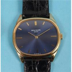 A Patek Philippe 18ct Yellow Gold Wristwatch, with a blue dial, on a Patek Philippe leather strap an