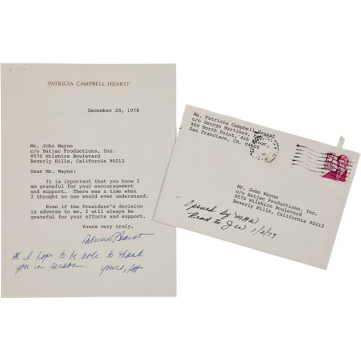 A Patty Hearst Signed Letter, 1978. Typed on personalized stationery, sent to JW in Beverly Hills, CA, dated "December 28, 1978," reading in part "It is important that you know I / am grateful for your encouragement / and support. There was a time when / I thought no one would ever understand," signed by Hearst in blue ballpoint ink in the lower right corner with a handwritten postscript about being able to thank Wayne in person; with original transmittal envelope; also included is a receipt for a mailgram that Wayne sent to Barbara Walters, dated "11/23/78," reading in part how he believed that "a ruthless group, the Symbionese Liberation Army, could (easily) brainwash one little girl by torture and degradation and confinement;" plus two newspaper clippings about Wayne's views on Hearst and a 'Help Patty Hearst' pamphlet.11" x 8 1/2" and smaller