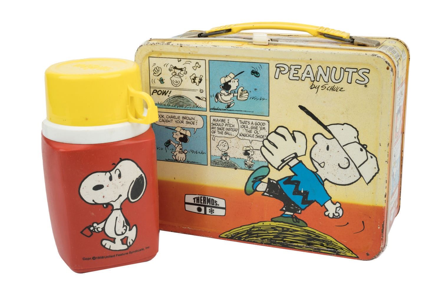 (Thermos, 1980) A Peanuts lunchbox by the King-Seeley Thermos Company. The thermos and lunchbox feature Snoopy, Charlie Brown, Lucy, and Woodstock. The lunchbox measures 8.75"x6.75"x4" and is in good condition, with few scuffs, minor oxidation, and little wear.