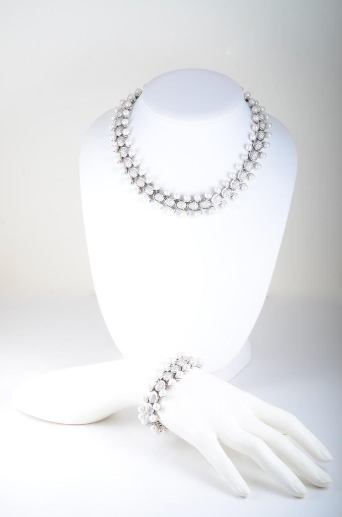 Comprising approximately 1300 round brilliant-cut diamonds, weighing around 17.00 carat, 114 pearls, each measuring 6-mm, and an 18K white gold mounting; necklace length 16-1/2 inches, width 3/4 inches, weight 156.5g; bracelet chain length of 7 inches, width 3/4 inches, weight 72.7g.