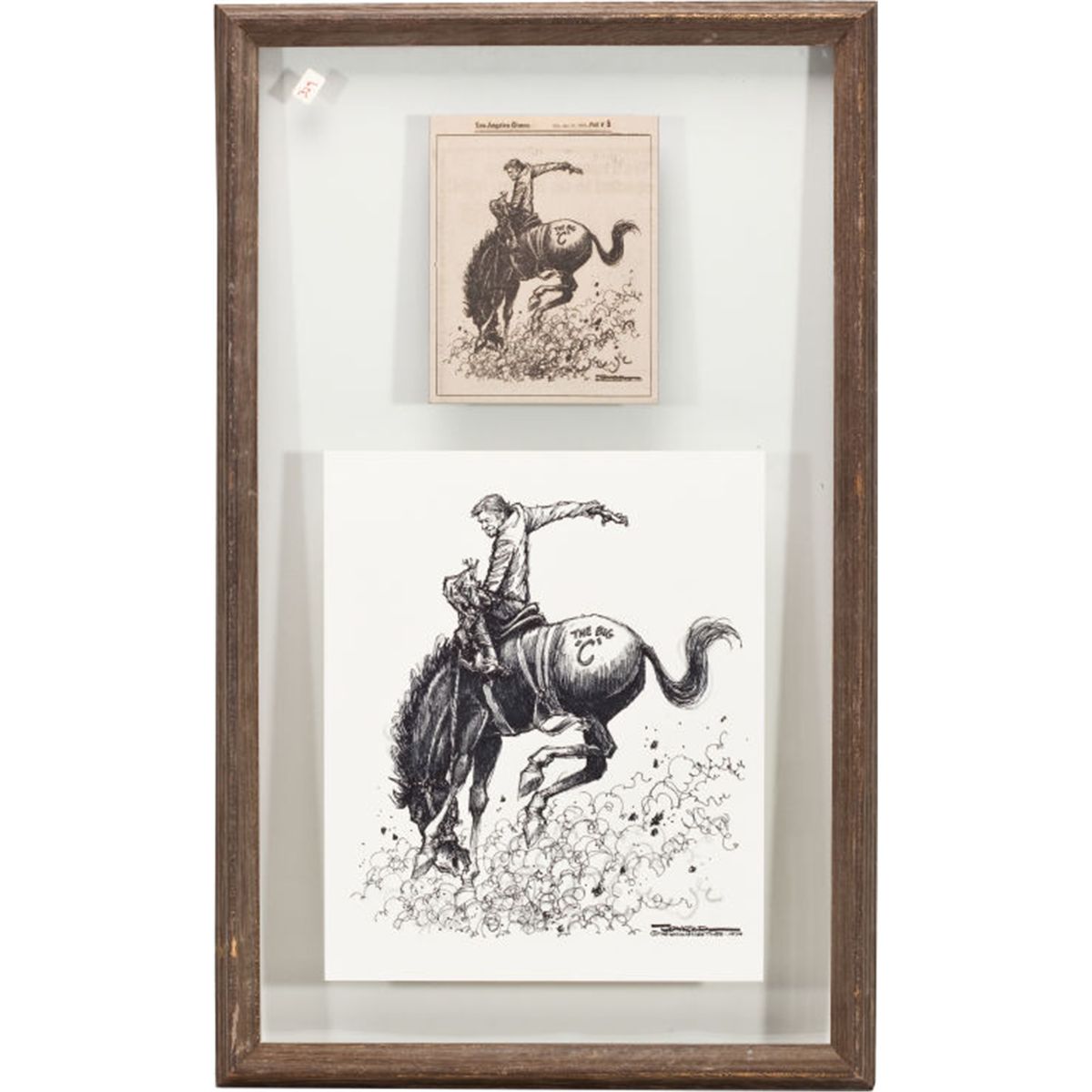 A Pen and Ink Drawing, 1979. Rendered on paper, depicting Wayne on a bucking horse, stamping out "The Big C," signed in the lower right corner "Conrad / The Los Angeles Times 1979," mounted above is the original newspaper cut-out of the cartoon which ran on Sunday, January 21, 1979; with a JW inventory sticker.Framed: 25" x 15"; Work Only: 13" x 10"