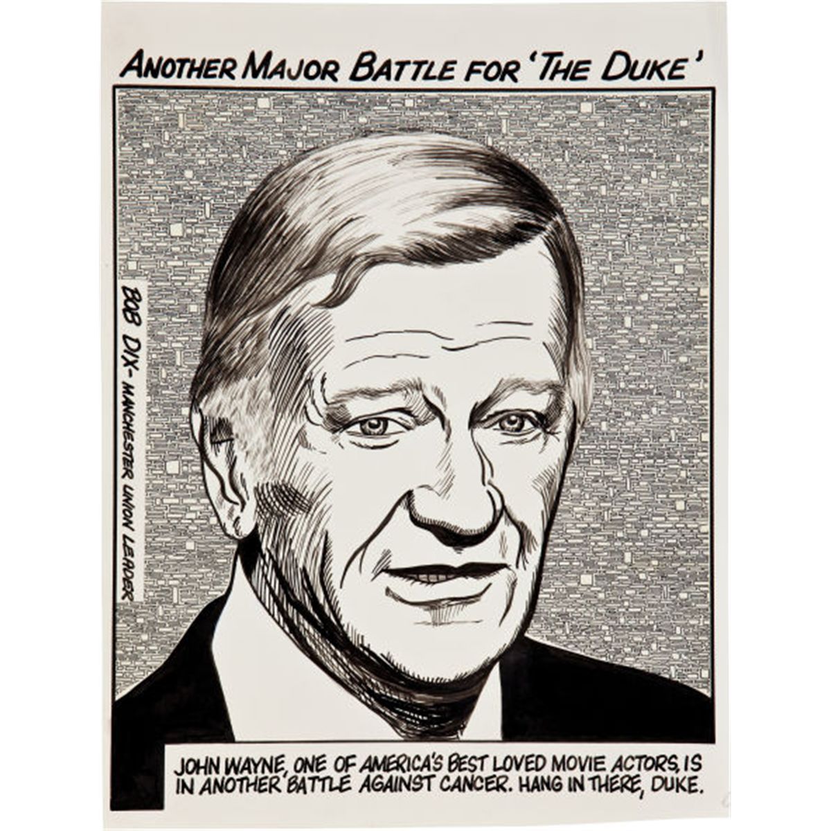 A Pen and Ink Drawing, Circa 1979. Rendered on paper, depicting an image of Wayne titled "Another Major Battle for The Duke;" created by cartoonist/illustrator Bob Dix to run in the Manchester Union Leader newspaper, likely sometime in 1979 when Wayne's cancer resurfaced.11" x 8 1/2"