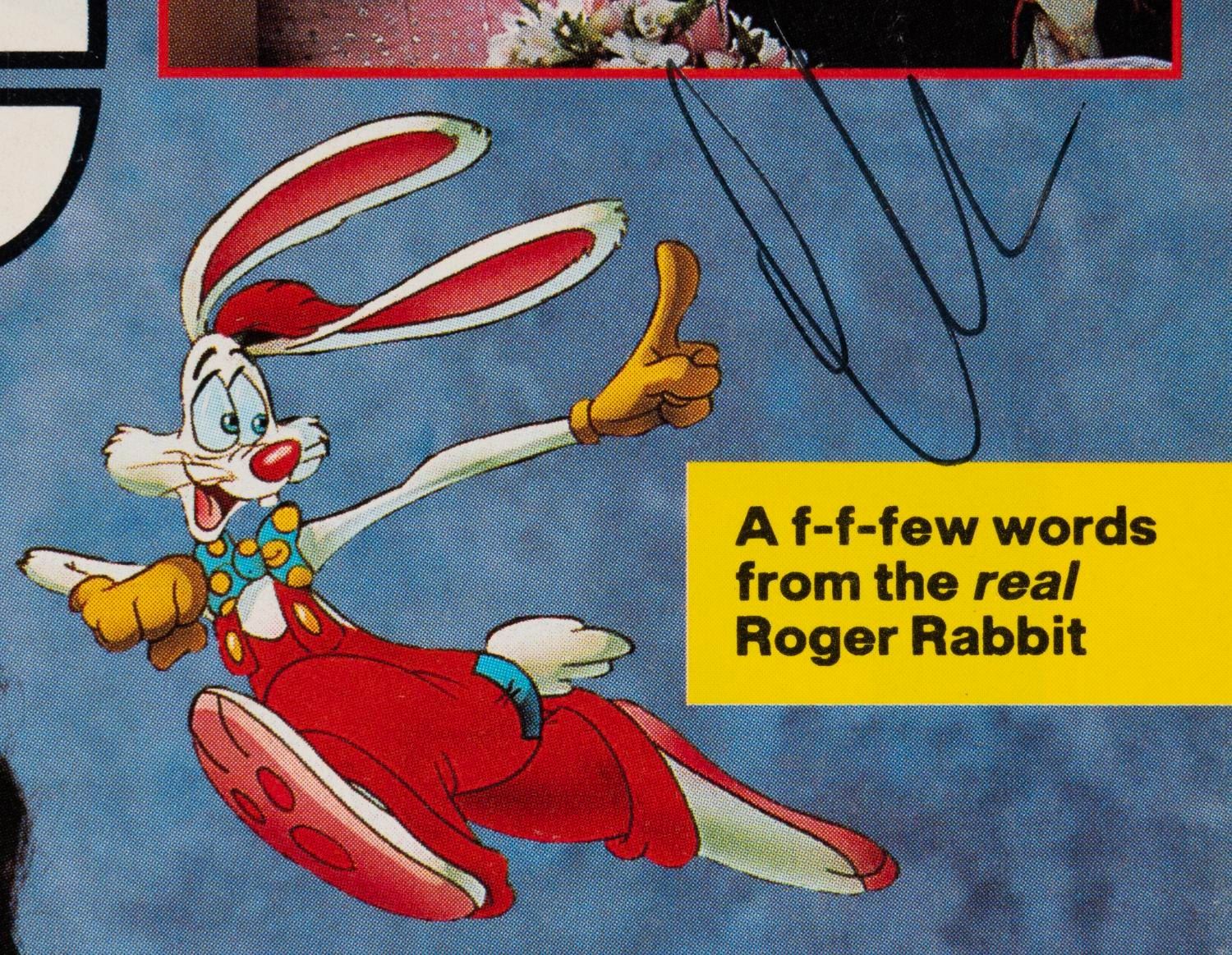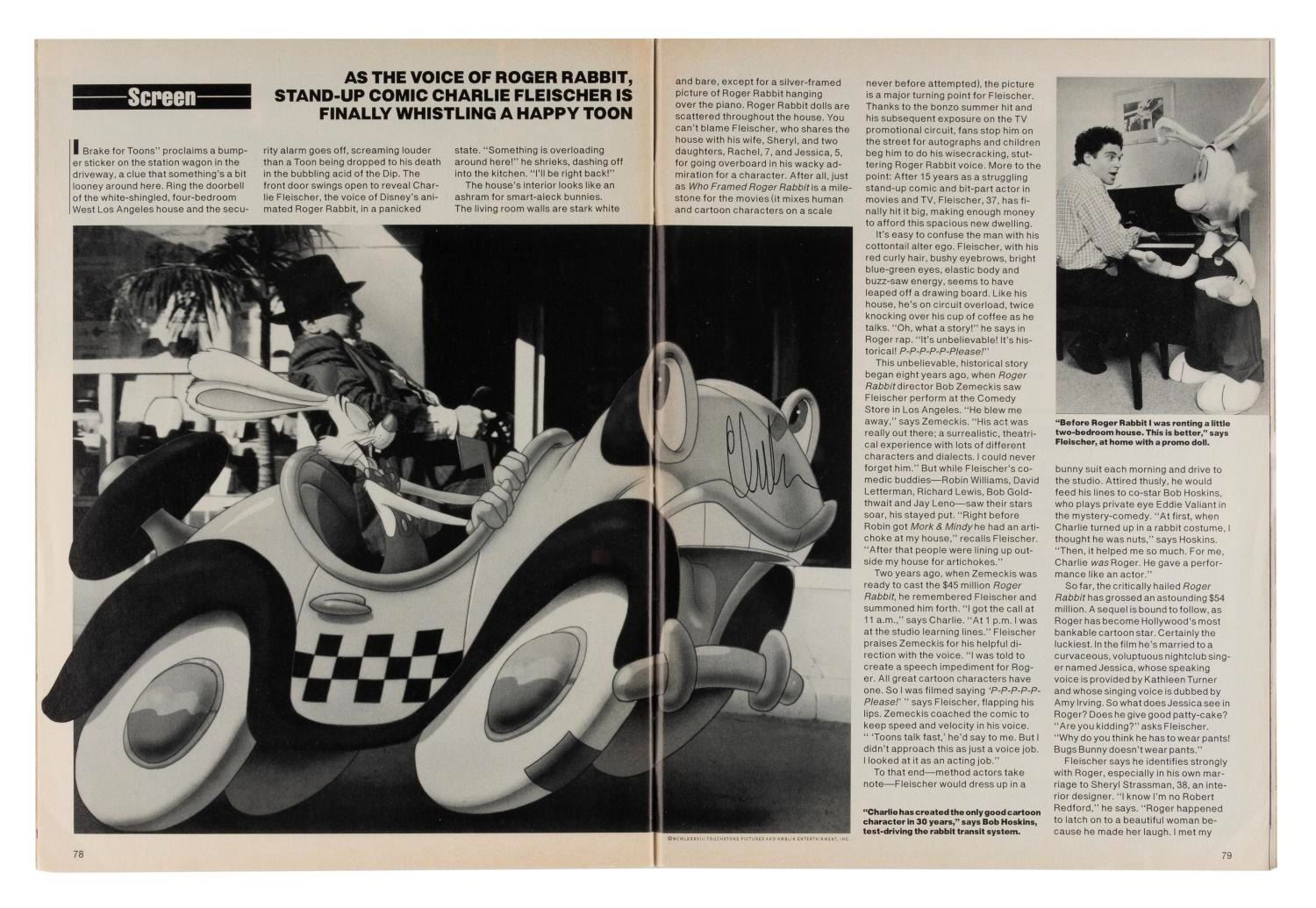 (Newsweek, 1988) A Newsweek magazine with a story on "Who Framed Roger Rabbit" signed by Charles Fleischer, the voice of Roger himself. Fleisher signed both the cover and the article inside. Measuring 8" x 11", the magazine is in very good condition with light wear to the cover's edges.