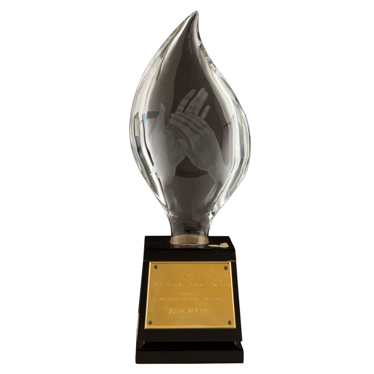 A 'People's Choice' Award, 1976. Presented to John Wayne; for "Favorite Motion Picture Actor;" with a JW inventory sticker.13" x 3 1/2" x 4"According to Ethan Wayne, this was one of his father's most treasured awards because it came directly from the fans.