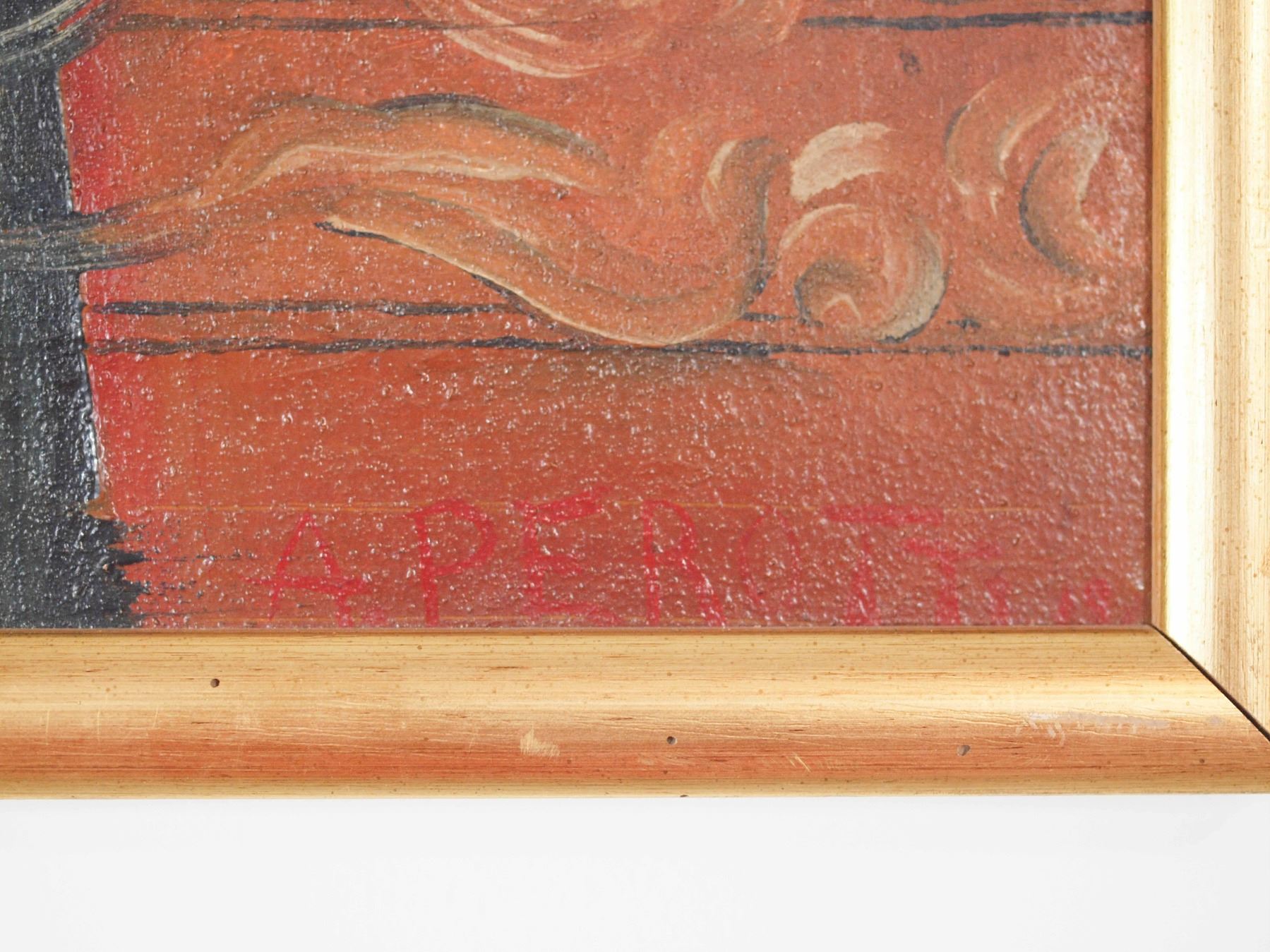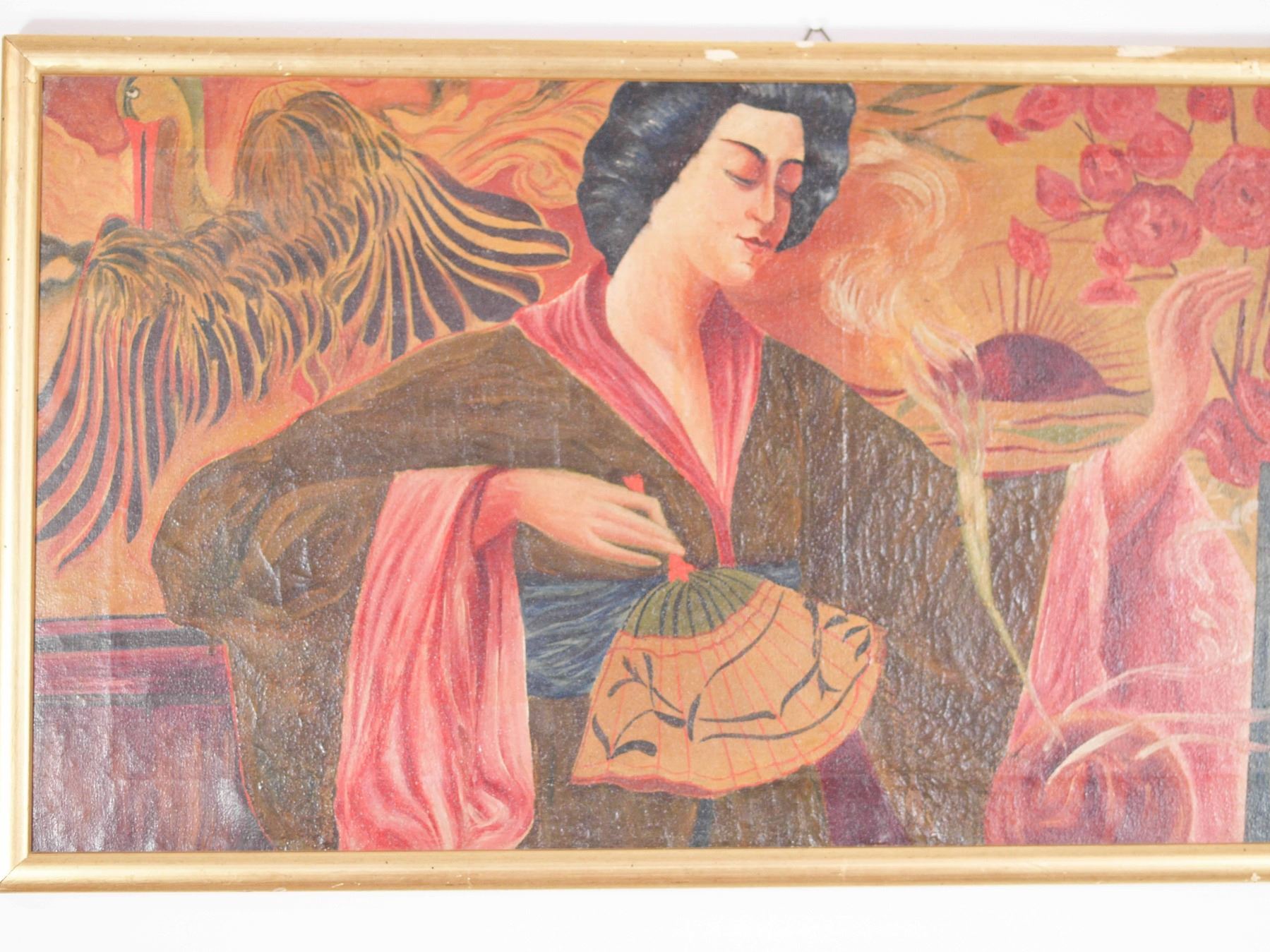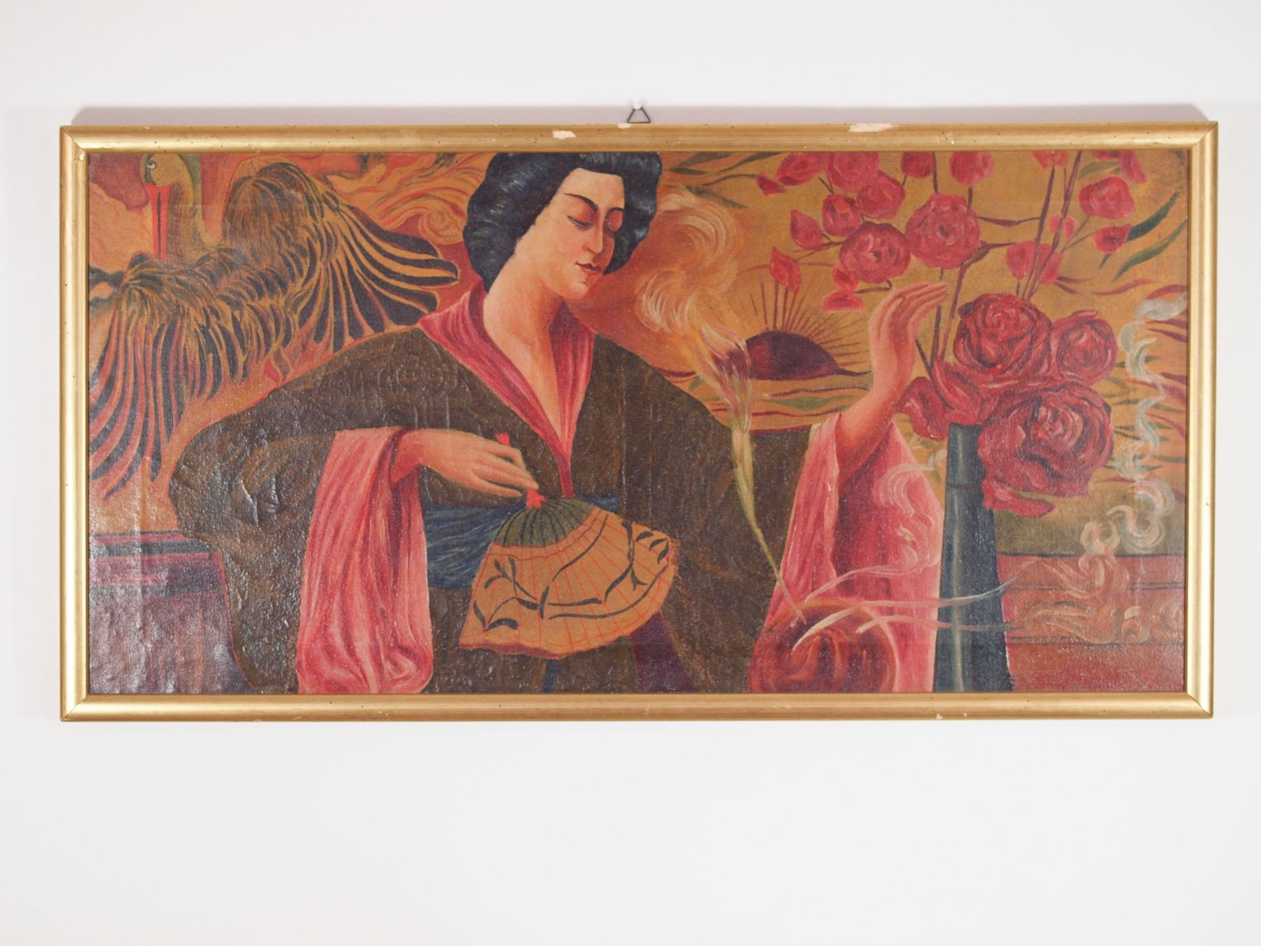 Early 20th century oil on canvas painting signed A. Perotti featuring a Geisha. The painting reflects the typical Italian orientalist taste of the Stile Liberty or Stile floreale (Art Nouveau) period of the late 19th and early 20th century. Size with frame: 93 x 48 cm (36.61 x 18.90 inches); tapestry: 88 x 43 cm (34.64 x 16.93 inches). PROVENANCE: Private collection, Italy