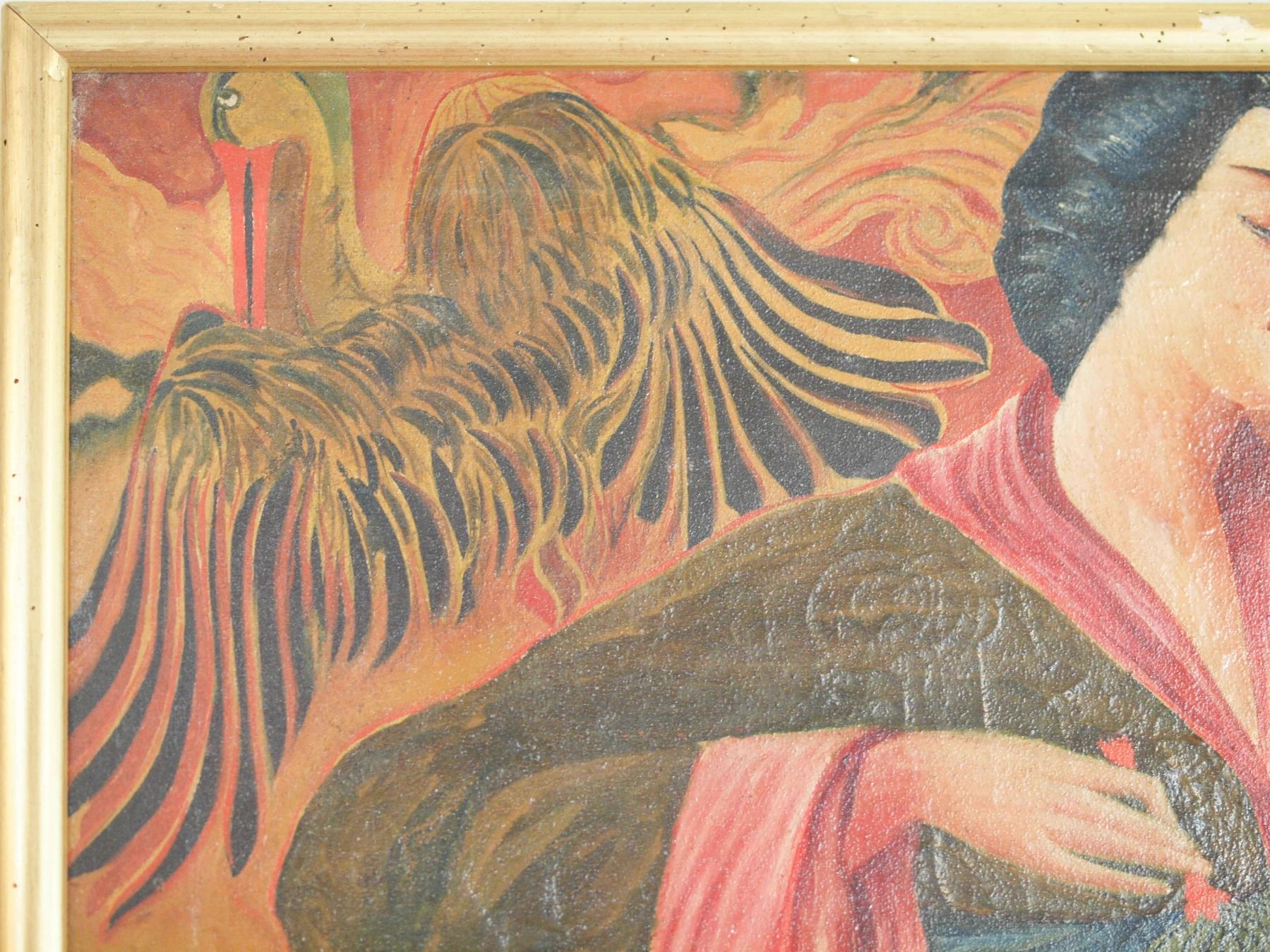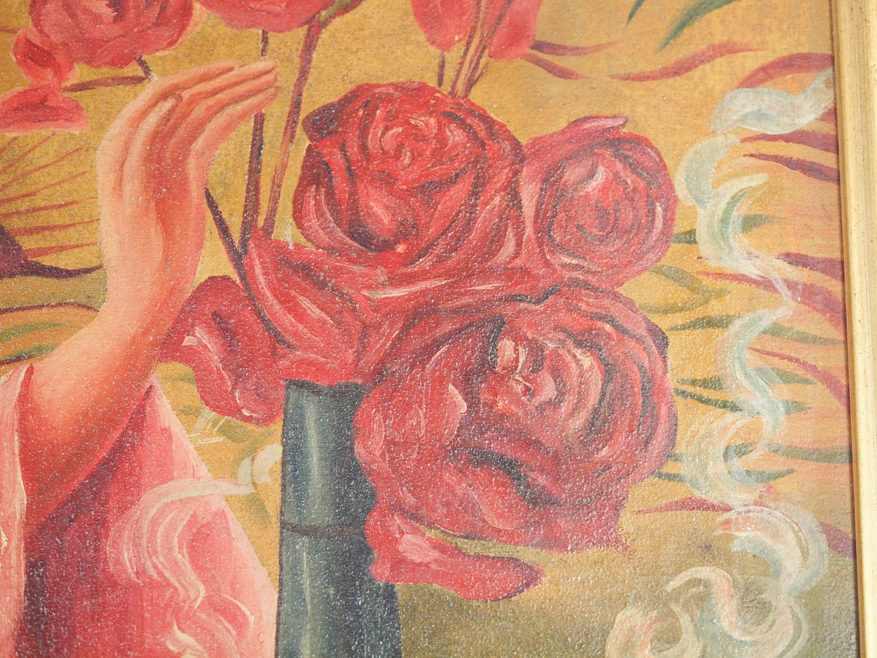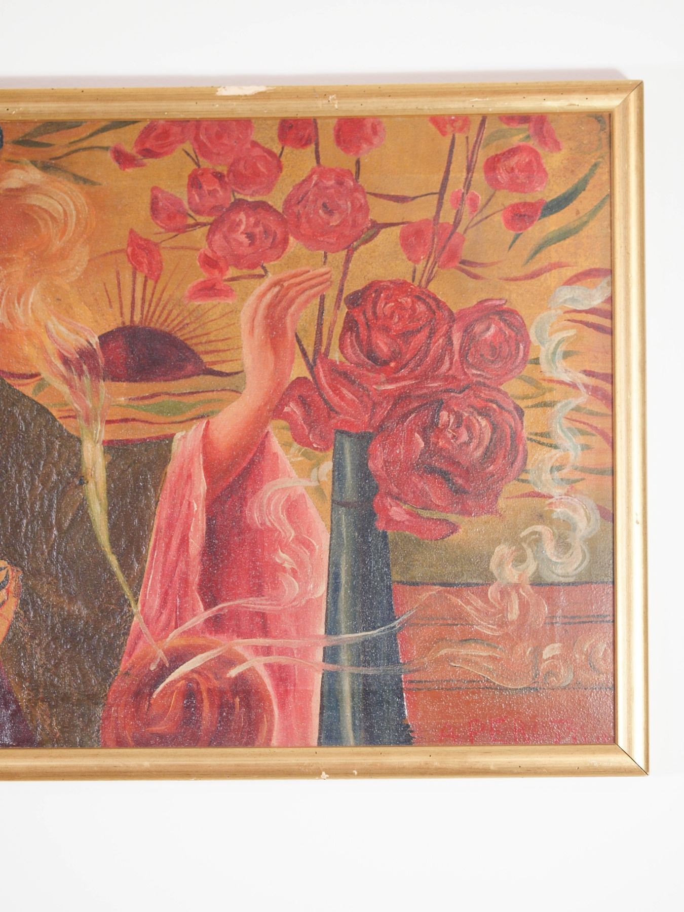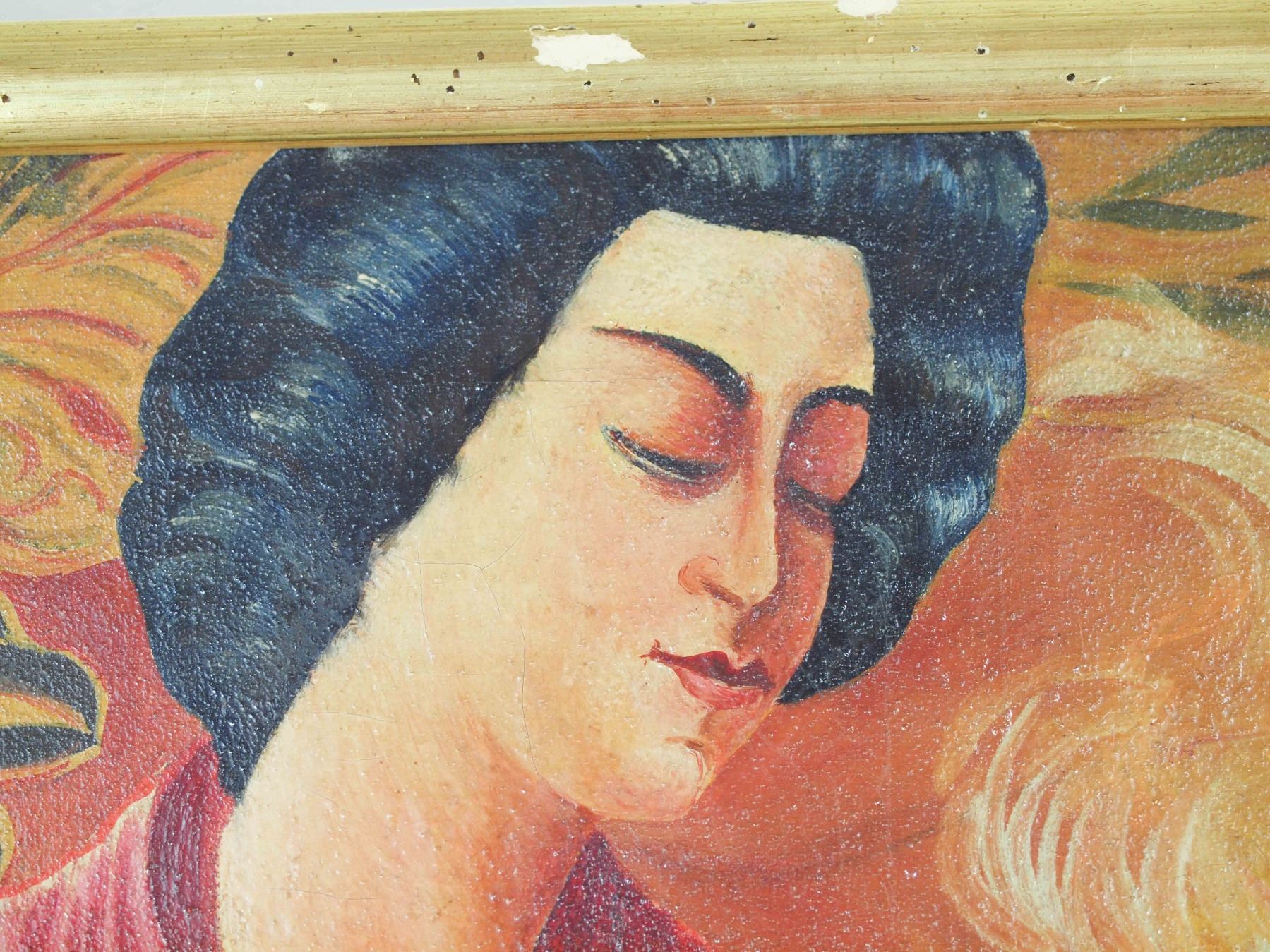 Early 20th century oil on canvas painting signed A. Perotti featuring a Geisha. The painting reflects the typical Italian orientalist taste of the Stile Liberty or Stile floreale (Art Nouveau) period of the late 19th and early 20th century. Size with frame: 93 x 48 cm (36.61 x 18.90 inches); tapestry: 88 x 43 cm (34.64 x 16.93 inches). PROVENANCE: Private collection, Italy