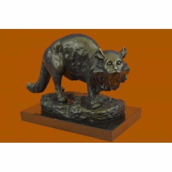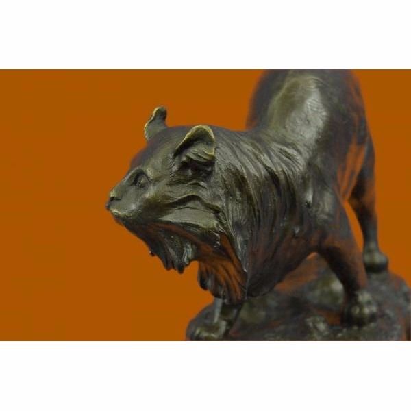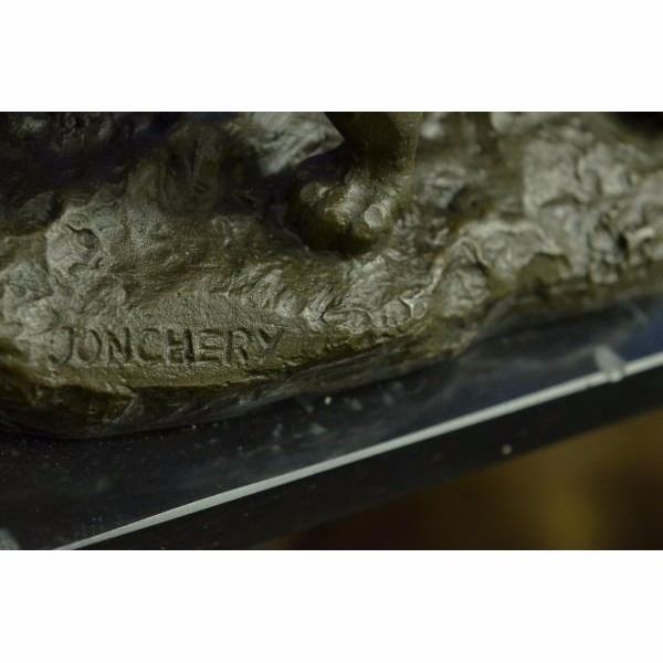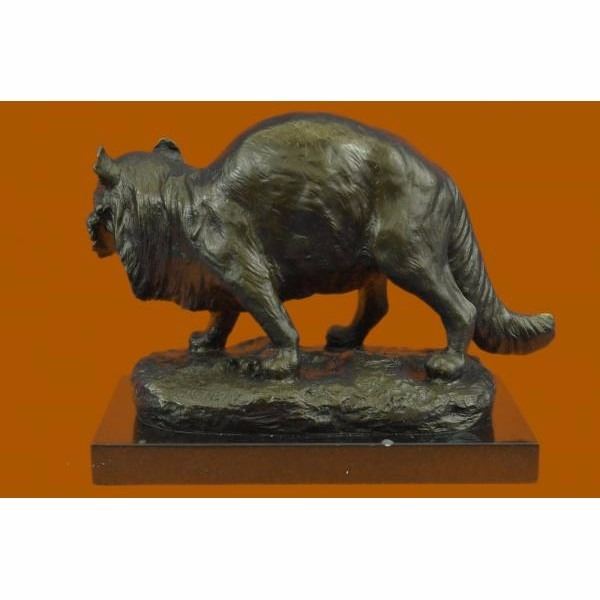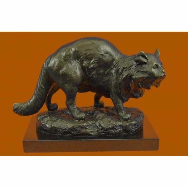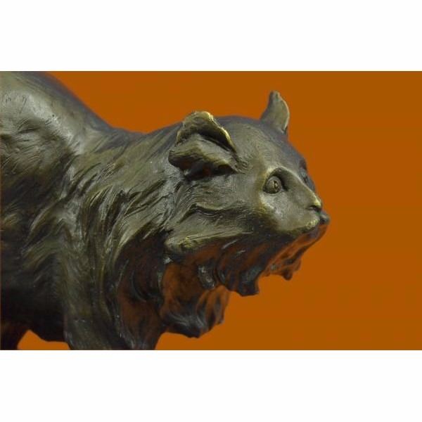 The friendly cat sits outside in the twilight of the night after taking a long cat nap. It sits with its tail wrapped up around it's back legs as it looks back at it's owner that calls it in for a tuna dinner. Cats stand for deep understanding in this natural world, as if a physic mind was in them. The symbolic significance of cats has is an ancient history. Some meanings are astuteness, clever, mysterious, intelligence, intuition, supernatural, and independence. Often, when a cat makes an uncommon appearance in our lives, it is a message for us to shake up our habitual routines and make some fresh changes in our lives. The handmade bronze sculpture was molded using the ancient method of lost-wax casting and stained with a brown patina finish for preservation. It is mounted upon a black marble base with the artist Jonchery signature. Condition : This sculpture is in perfect condition. Bronze Dimensions with Marble Base:Height 7" X Width 9.5" Marble Dimensions:8" x 5" Height without base: 6" Weight : 9 LBS Inventory : 38AL1264883