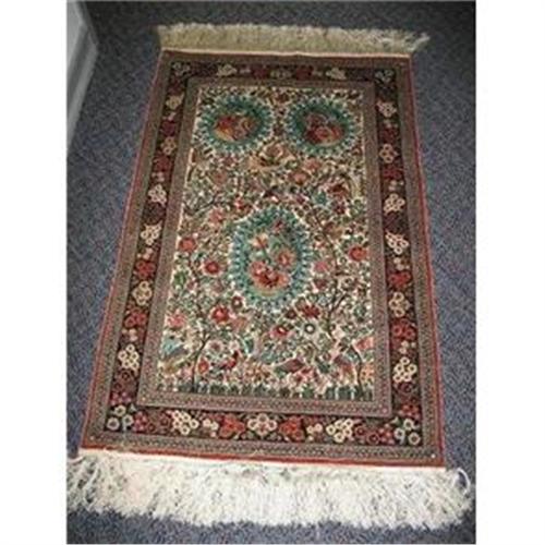 A persian Qum silk carpet, embellished with flowers and birds circa 1.2 million knots per square meter. circa is 1970 and size is 124 x 77 cm.