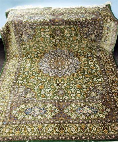 A Persian Qum silk rug. Signed in the border....