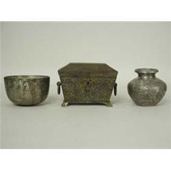 A Persian metal and engraved shouldered vase and bowl, and a damascenedsarcophagus shaped casket. (3) Est.100/150
