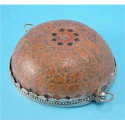 A Peruvian ? white metal mounted maser, carved with European native hunters amongst trees and inscribed, 'Dedicado Pa El Sr Sub Prefecto De Lucanas Dn Jose Manuel Caseres', 7.75ins. £300-500
