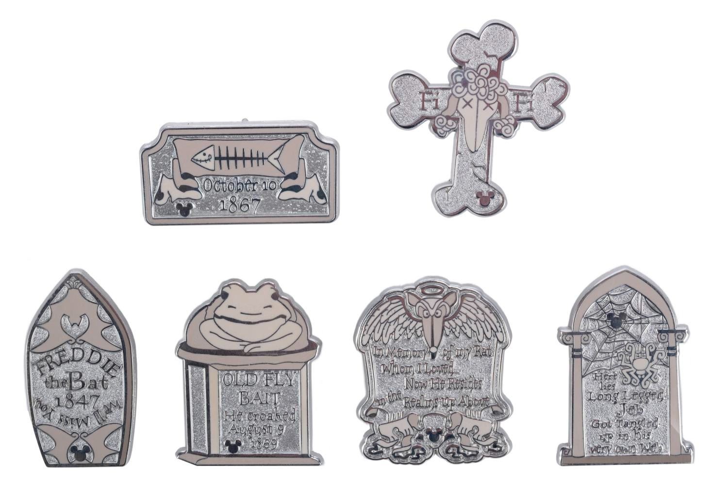 (Disney Parks, 2009) A Rare Disney Parks Pet Cemetery Hidden Mickey Tombstone (6) Pin Set. Each pin of this retired set is in fine condition.