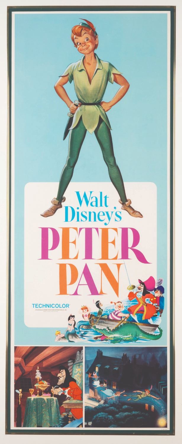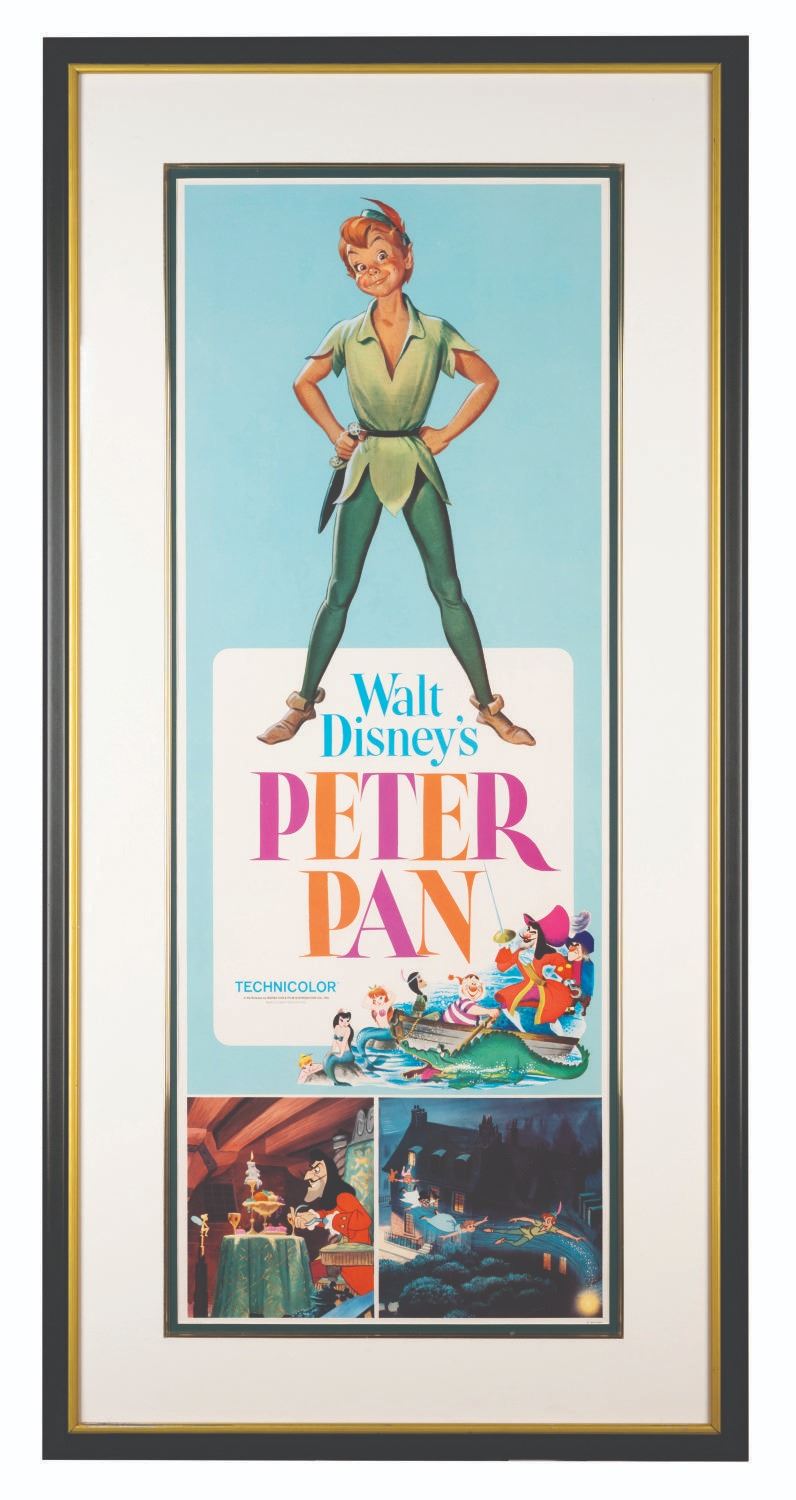 (Disney, 1969) A framed insert poster for the 1969 re-release of "Peter Pan." Measuring 13.5" x 35.25" in a 22.25" x 44.25" custom frame, the poster is in very good condition with light creases, while the frame displays in very good condition with scratches and wear.