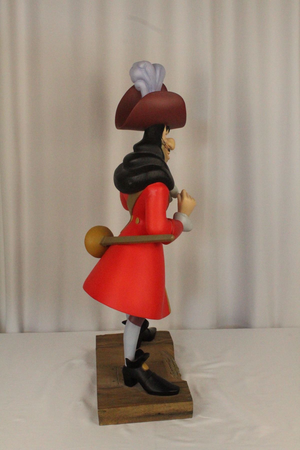 (Disney, 2003) A limited edition Captain Hook "Big Fig" statue designed by artists Kevin Kidney and Jody Daily, created to commemorate the 50th anniversary of the film in 2003. Released in an edition of only 1000 pieces, the exquisitely sculpted figure is constructed of cast resin, painted with screen accurate detail, and finished with a faux hair, waxed mustache. Hook stands on an integral faux wood base crafted to look like the deck of Jolly Roger. Measuring 16"x8" and 28.5" tall, the piece is in good condition with the sword having on of the posts unattached and some rubbing on the right side.