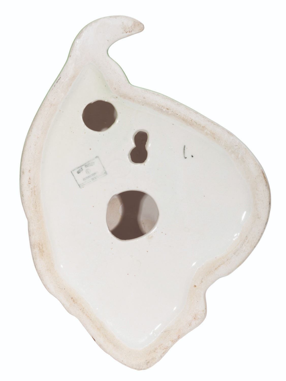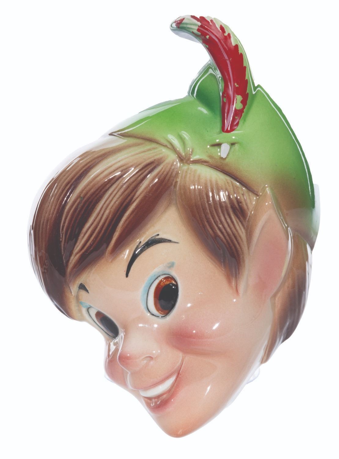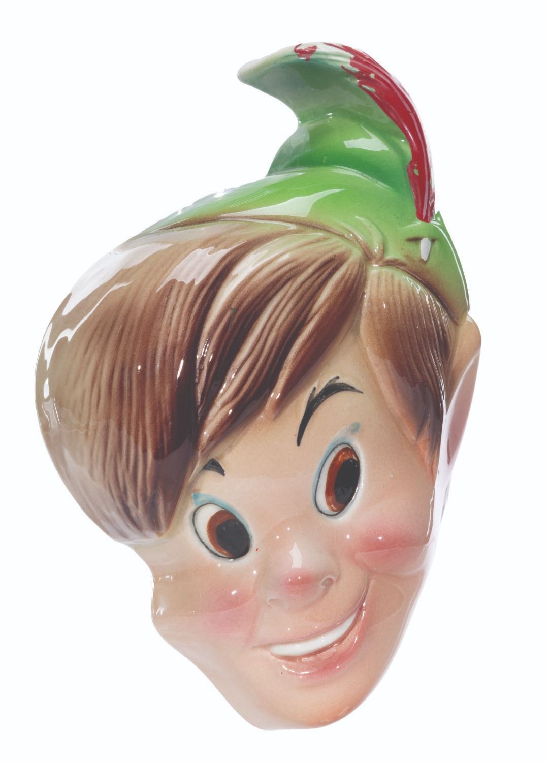 (Disney, 1950s-60s) A ceramic wall decoration of Peter Pan's face. Measuring 5" x 6" x 1.75", the piece is in good condition with light crazing, and paint loss only to the red feather.