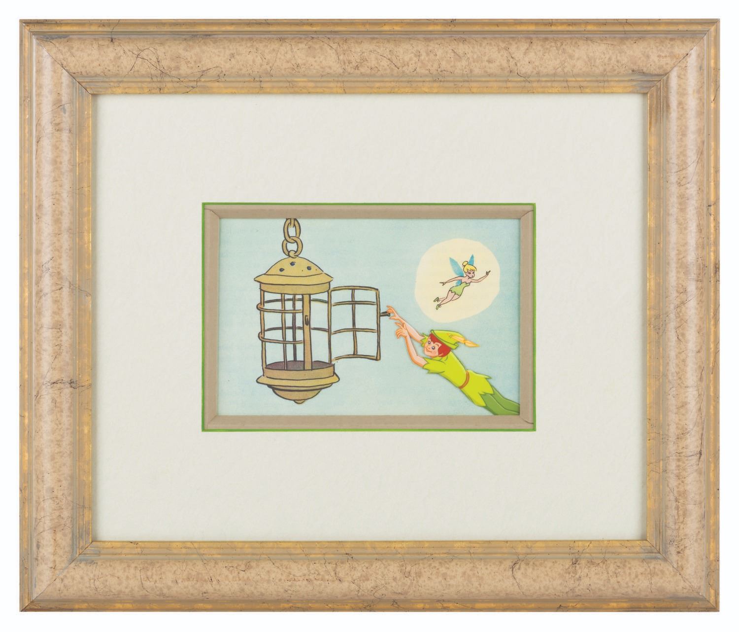 (Post, 1970s-80s) A cel of Peter Pan from a Peter Pan peanut butter commercial, paired with a 3.75” x 5.75” printed background with Tinker Bell from the Disney film. The cel has been trimmed to the image measuring 3.25” x 1”, and displays in fine condition. The 11.5” x 13.5” framed piece displays in very good condition.