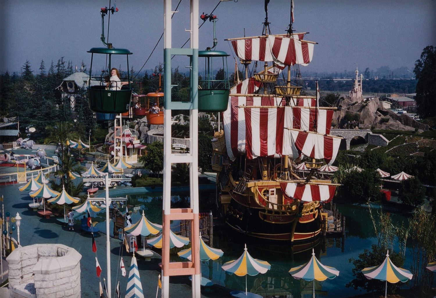 (Disneyland, 1980s-90s) A decorative oversized vintage 1960s photograph of the Skyway over Fantasyland that once hung in a Backstage Area of Disneyland. Measuring 29.75"x20", the large photo print is in very good condition in original frame with minor wear throughout from age.