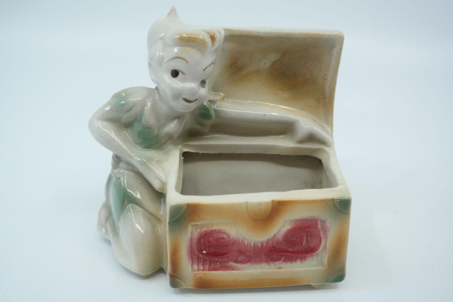 (Leeds, 1950s) A ceramic planter of Peter Pan with a toy chest, manufactured by Leeds. Measuring 4" x 2.5" and 4" tall, the ceramic is in very good condition.