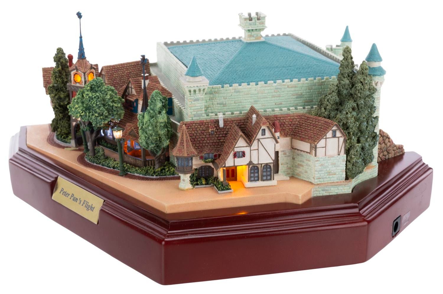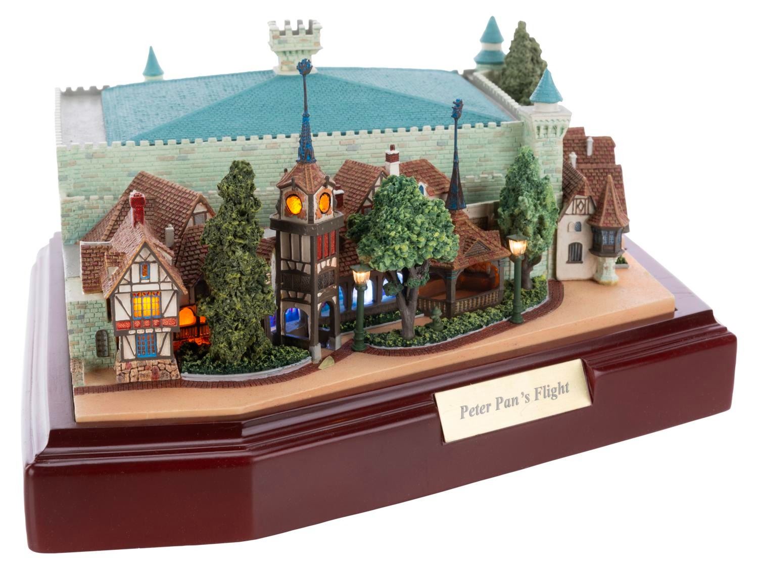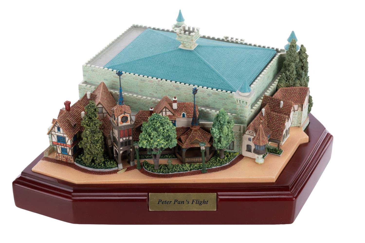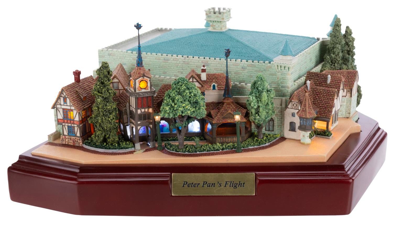 (Olszewski, 2006) An incredible scale model of Disneyland's "Peter Pan's Flight" attraction building by Robert Olszewski. This very rare replica includes two scenes from the attraction which can be inserted into the top of the model to form the building's roof and can be viewed from the back of the model. The interchangeable light-up scenes show a ride vehicle soaring over London and Neverland. Measuring 8.75" x 9.5" x 5" tall, the model is in fine condition.