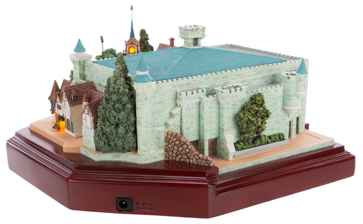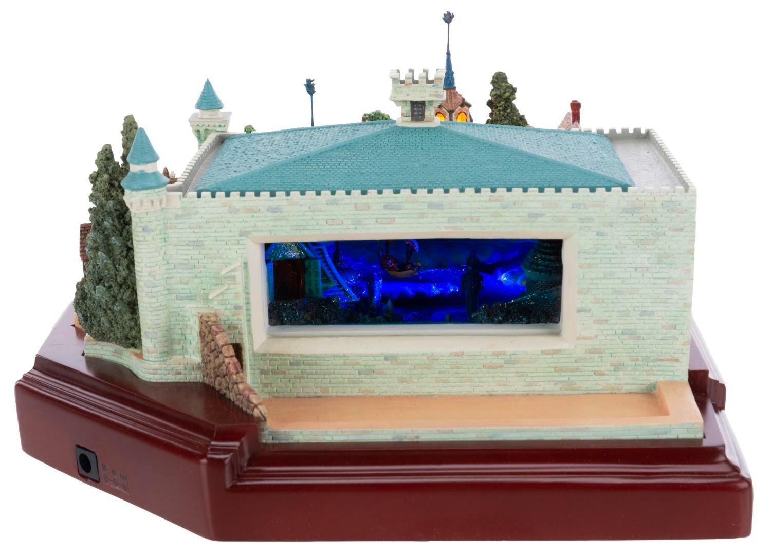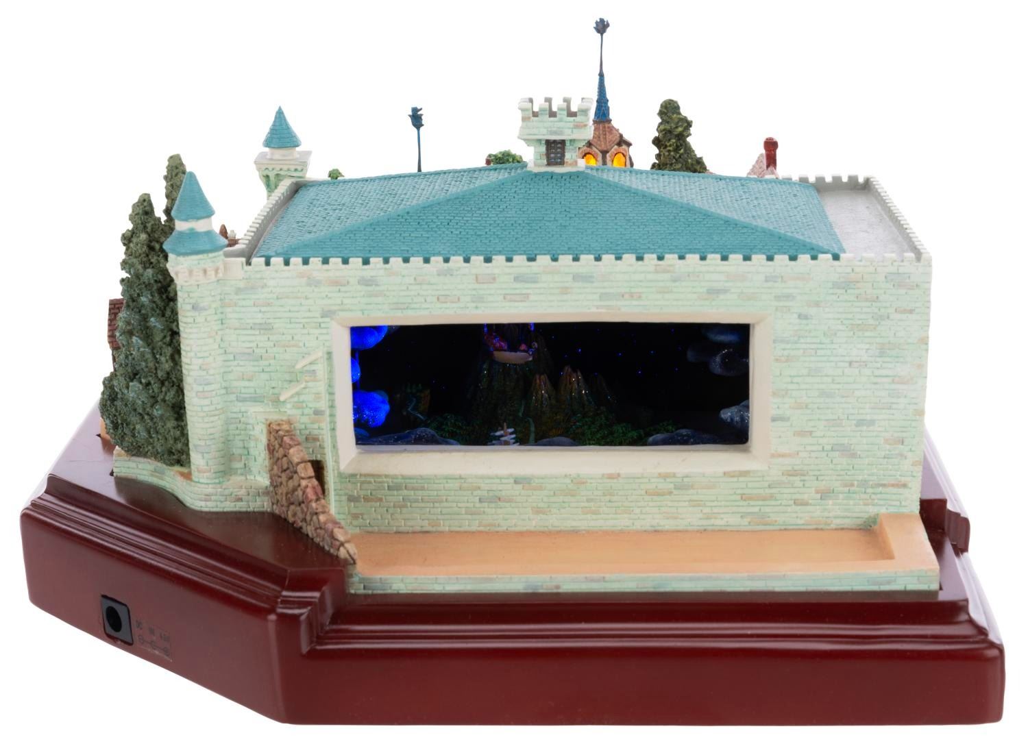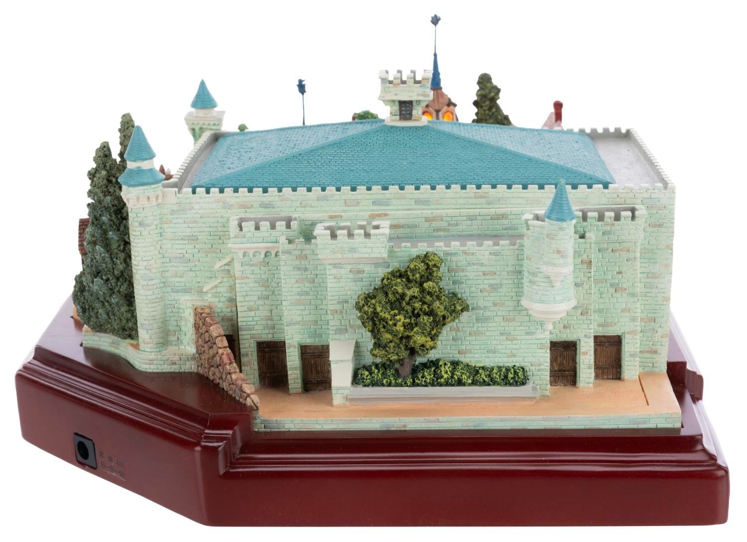 (Olszewski, 2006) An incredible scale model of Disneyland's "Peter Pan's Flight" attraction building by Robert Olszewski. This very rare replica includes two scenes from the attraction which can be inserted into the top of the model to form the building's roof and can be viewed from the back of the model. The interchangeable light-up scenes show a ride vehicle soaring over London and Neverland. Measuring 8.75" x 9.5" x 5" tall, the model is in fine condition.