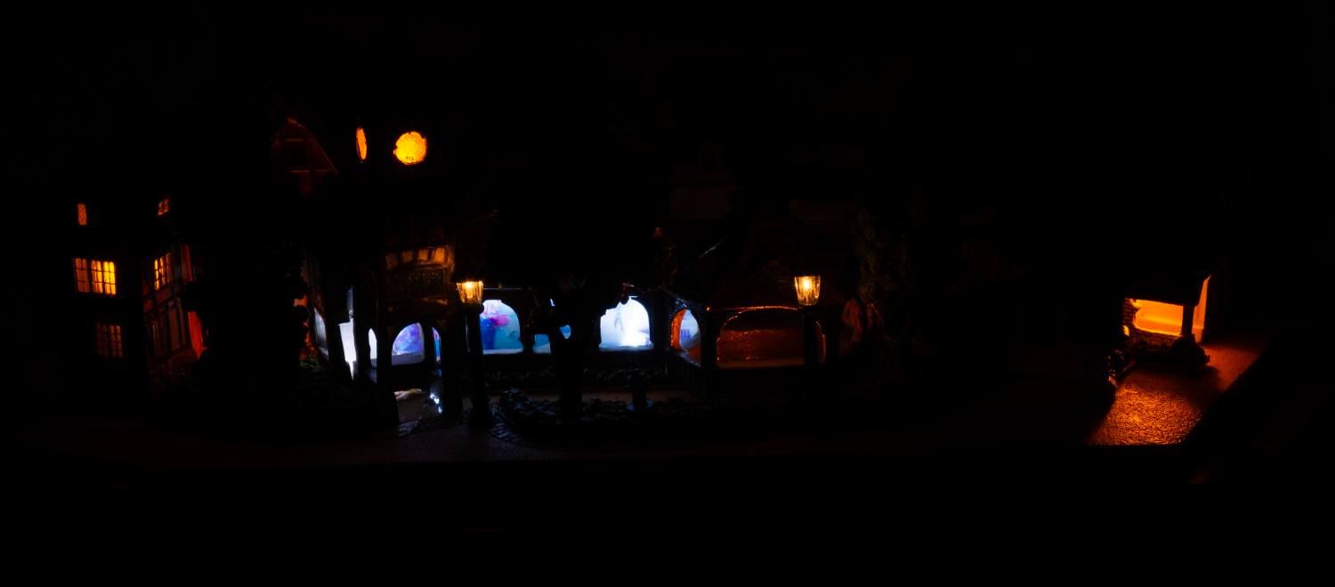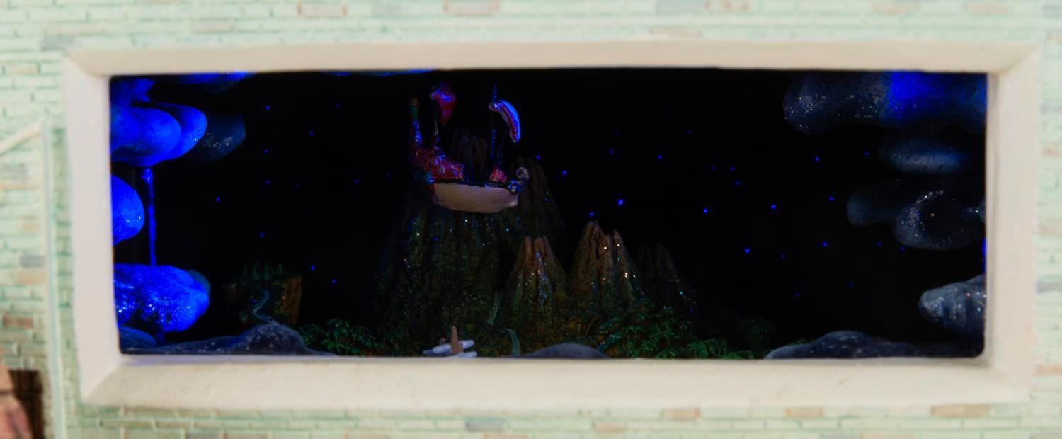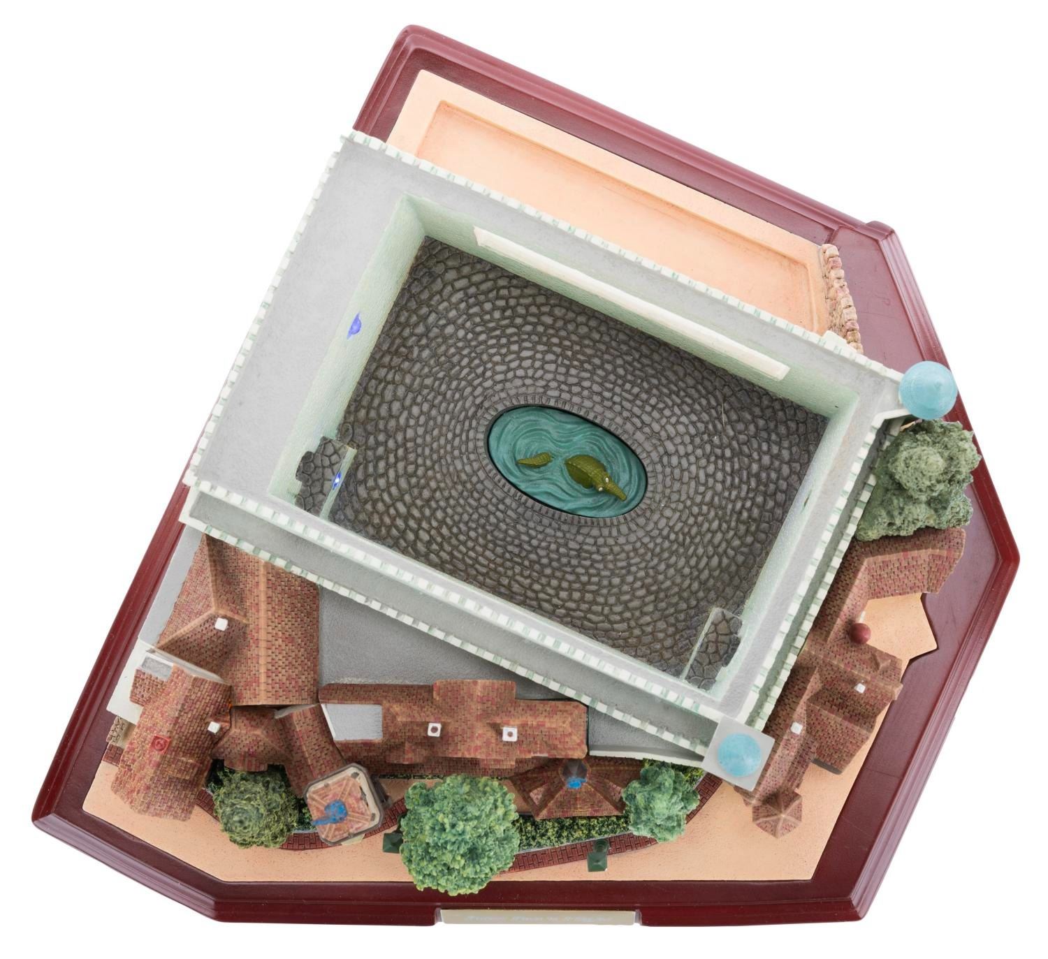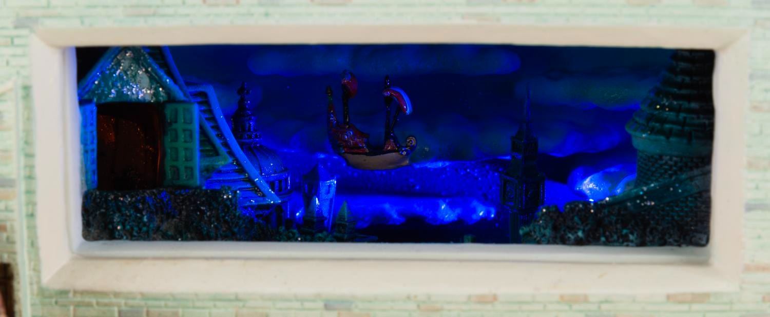 (Olszewski, 2006) An incredible scale model of Disneyland's "Peter Pan's Flight" attraction building by Robert Olszewski. This very rare replica includes two scenes from the attraction which can be inserted into the top of the model to form the building's roof and can be viewed from the back of the model. The interchangeable light-up scenes show a ride vehicle soaring over London and Neverland. Measuring 8.75" x 9.5" x 5" tall, the model is in fine condition.