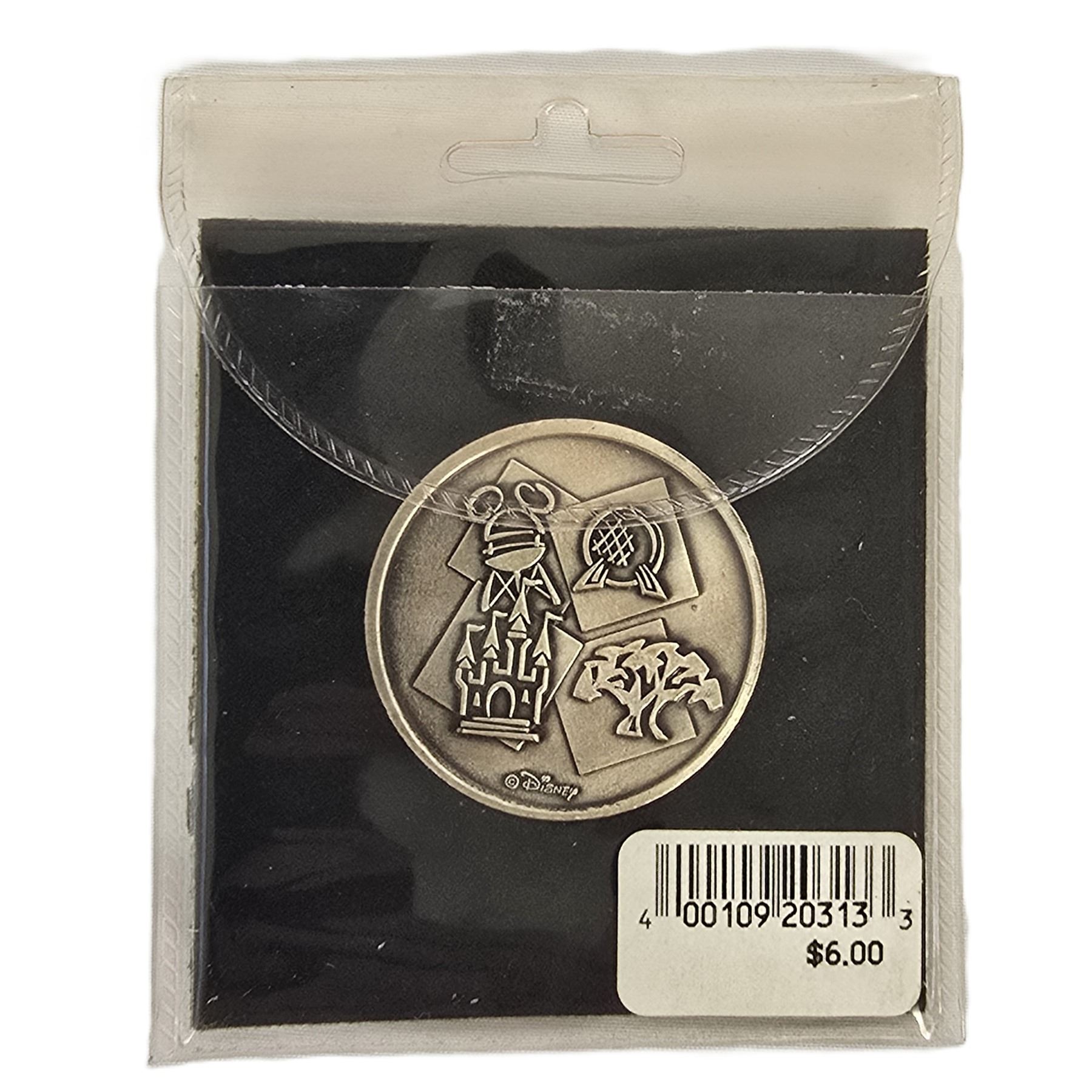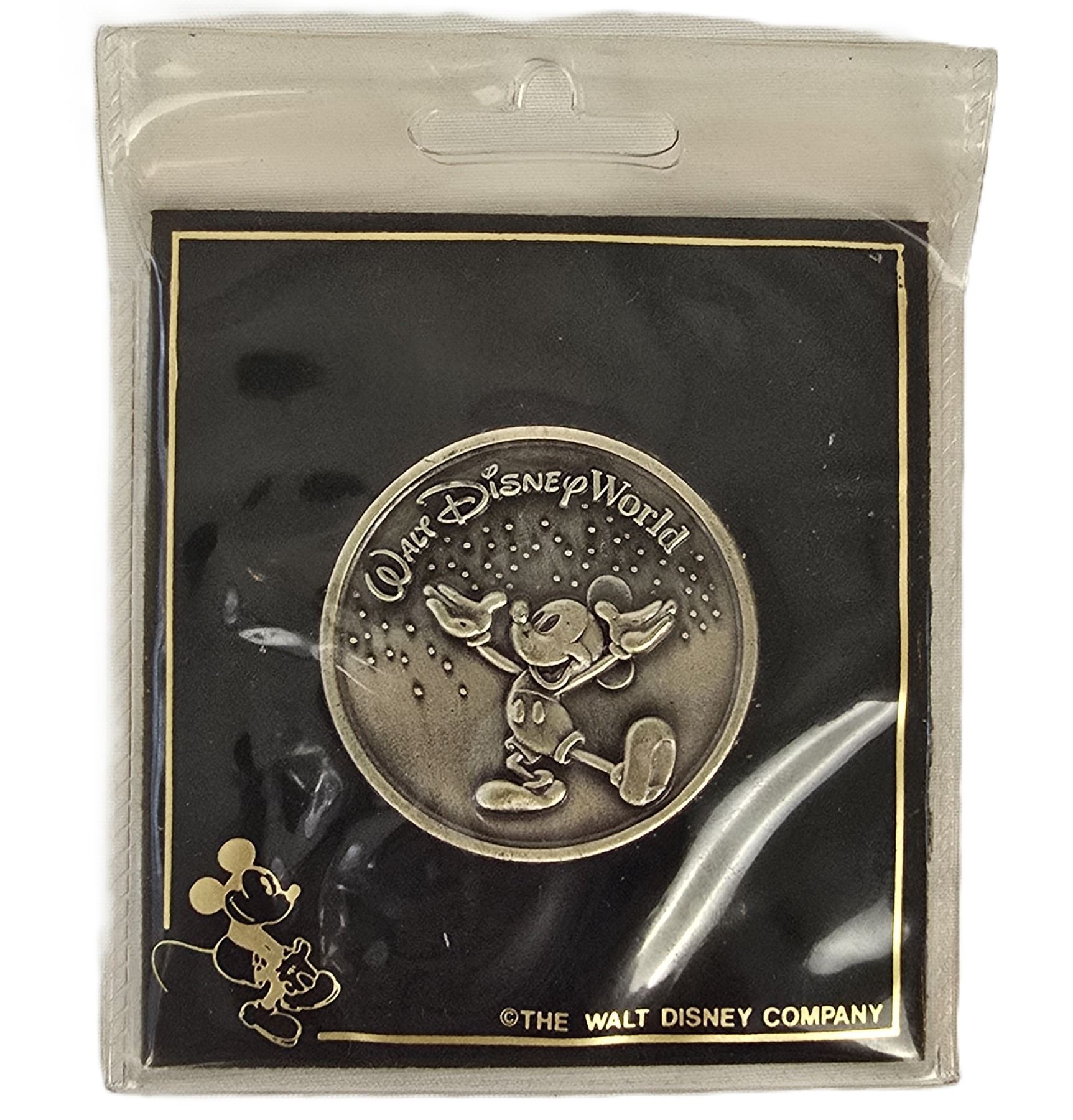 (Walt Disney World, 2000) This is a Walt Disney World Mickey Mouse pewter medallion. It features a raised image of Mickey Mouse with his arms in the air and the words "Walt Disney World" inscribed around the top. The back features the logo of each of the four parks. It is unopened in its original package with the original price sticker. It is flat and measures 4" x 3" and weighs 1.4 oz.