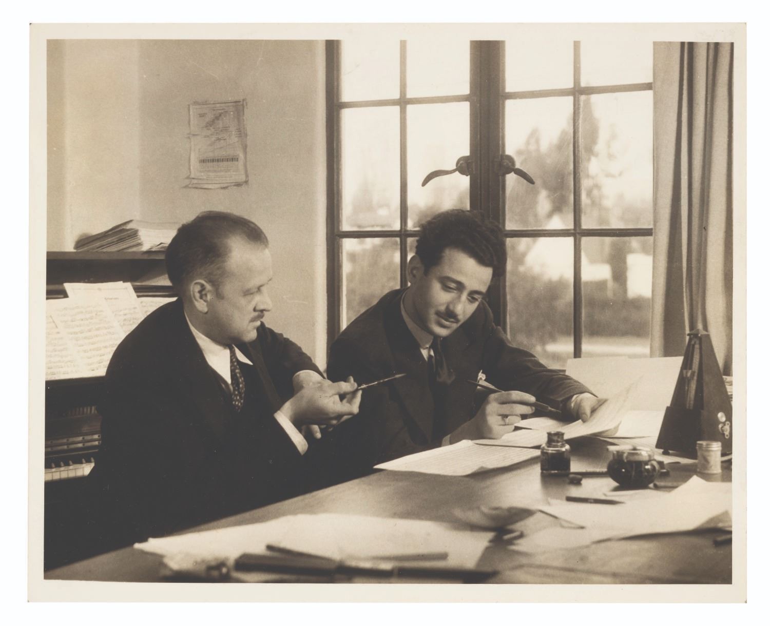 (MGM, 1934) A photo of composers Carl Stalling and Art Turkisher working on the score to “Jungle Jitters” from Ub Iwerks’ Willie Whopper series of shorts. Measuring 8” x 10”, the black and white glossy photo is in very good condition with light corner wear and paper remnants from a scrapbook to the reverse.
