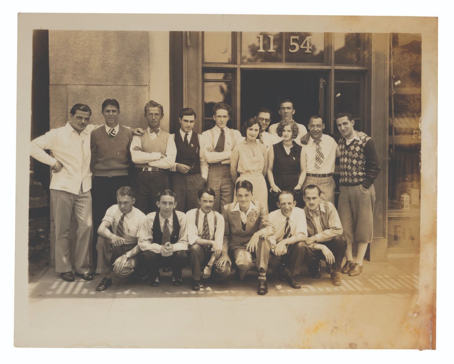 (Harman-Ising, 1928) A photo print of Hugh Harman and Rudolf Ising with staff from their time directing “Oswald the Lucky Rabbit” cartoons for producer Charles Mintz. Ising is standing at the far left. Harman is in the center front row, with Ham Hamilton to his left and Friz Freleng to his right. Mintz is on the left side of the doorway to the Winkler Pictures Studio at 1154 N Western Avenue in Los Angeles. Measuring 8” x 10” the glossy photo is in good condition with edge wear, creasing at the bottom right corner, and toning.