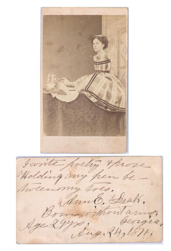 ANNA ELIZA LEAK. ISP. 2 1/2" x 4 1/4". n.p. Aug. 24, 1871. A carte-de-visite signed and inscribed on the verso by Leak: "I write poetry & prose holding my pen between my toes. Ann E. Leak Born without arms age 29 years Georgia Aug. 24, 1871." The photograph shows her sitting on a counter with her bare feet on a silver tea service. Considering the circumstances, the writing is incredibly neat, dark and legible. She performed this routine in the same shows that featured Tom Thumb, among other noteworthy attractions. It was Barnum who invented the concept of the sideshow as a source of additional income, and also he who merged his "Hall of Human Oddities" with his circus. It is quite rare to see remnants of Barnum's spectacles, save those of Tom Thumb, in our age. The item shows some wear around the edges, but is in fine condition overall, and a reminder of what passed for entertainment years ago.
