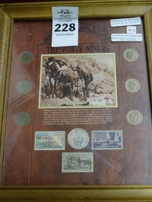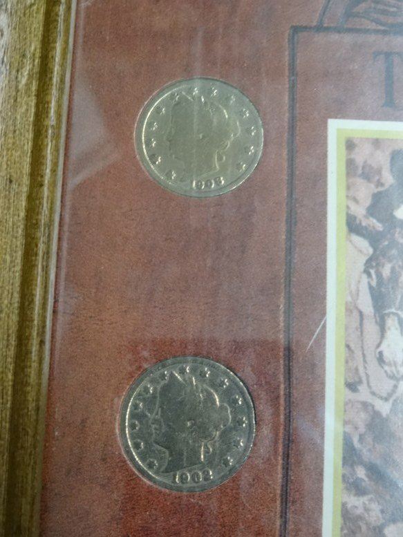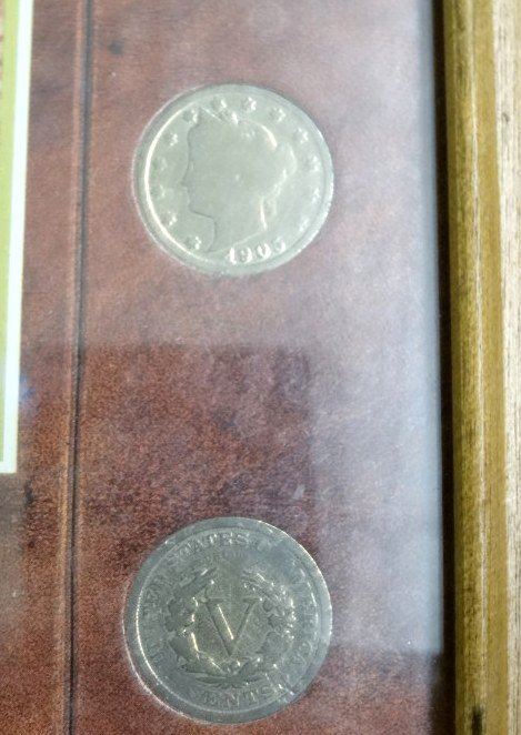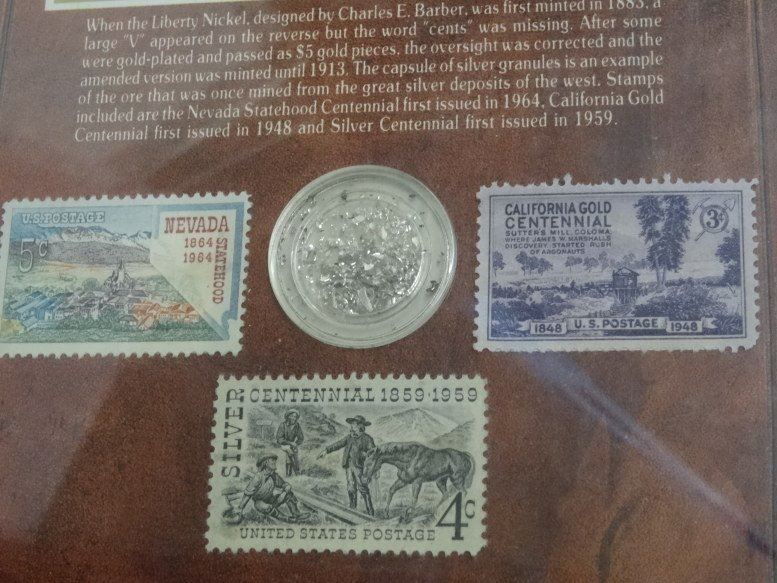 A Picture Frame With A V-Nickel Collection, Stamps & Genuine Silver Granules