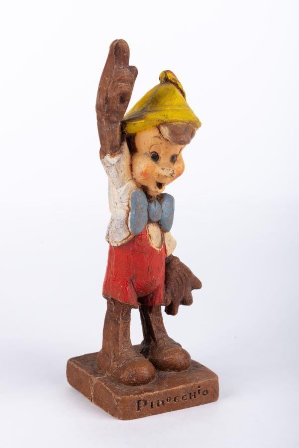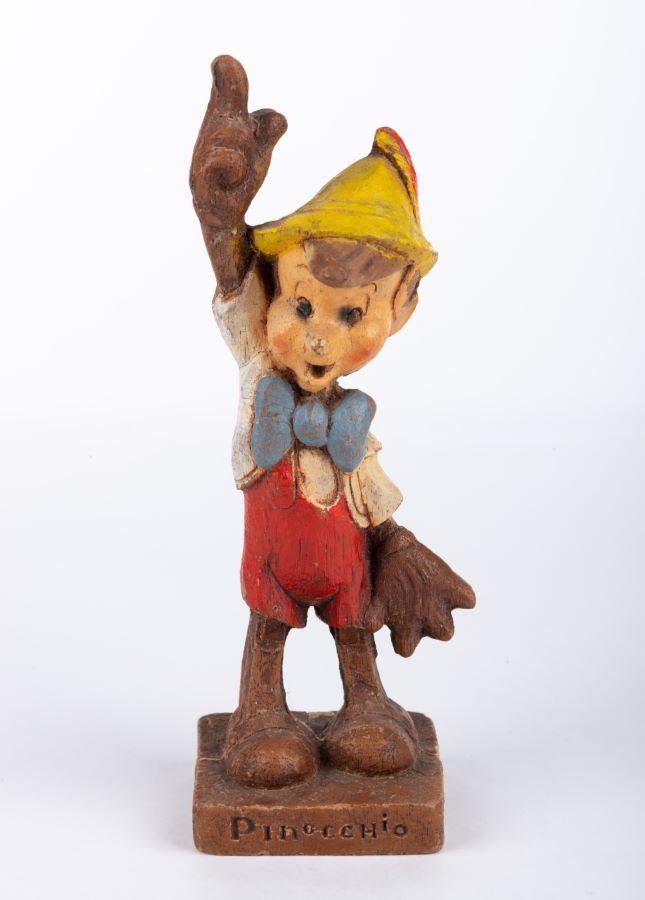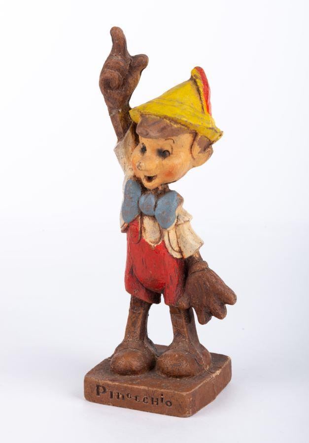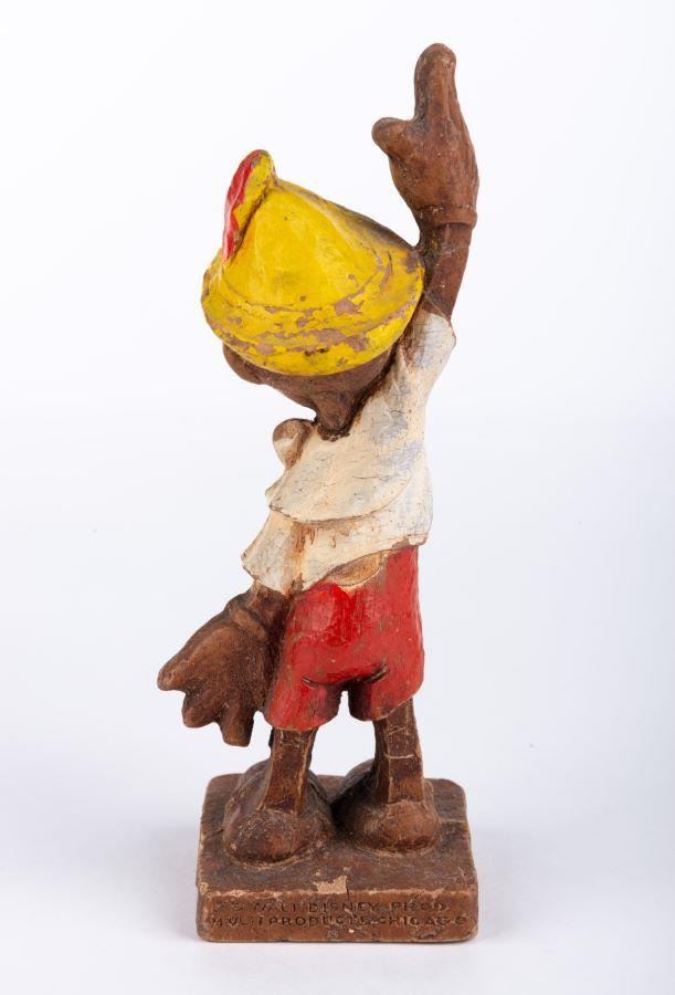 (Multi Products, 1940s) A Pinocchio faux wood resin figurine, manufactured by Multi Products of Chicago. Measuring 2.75" x 2.5" and 7.5" tall, the figurine is in very good condition with some wear from age, minor paint loss, and handling wear.