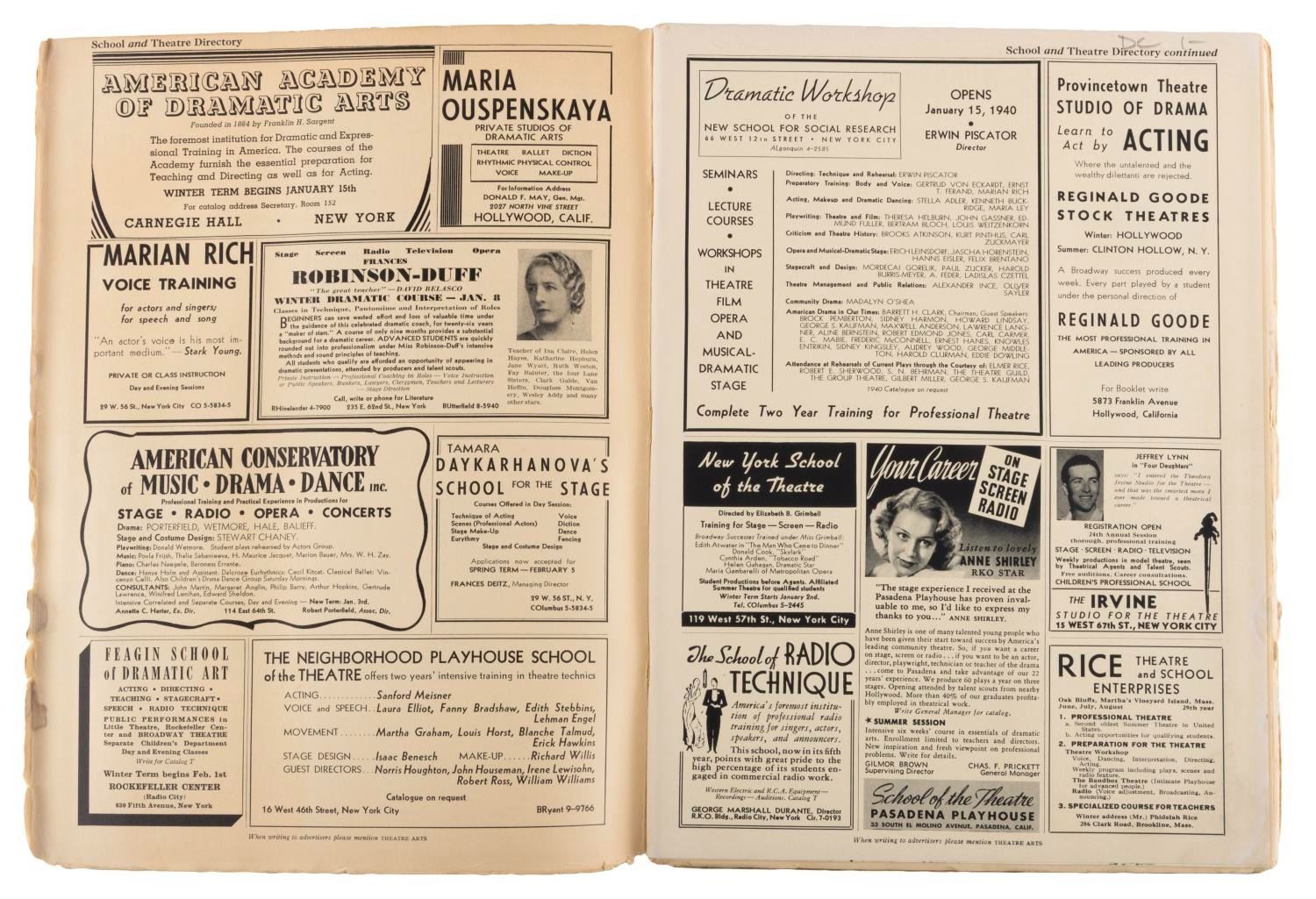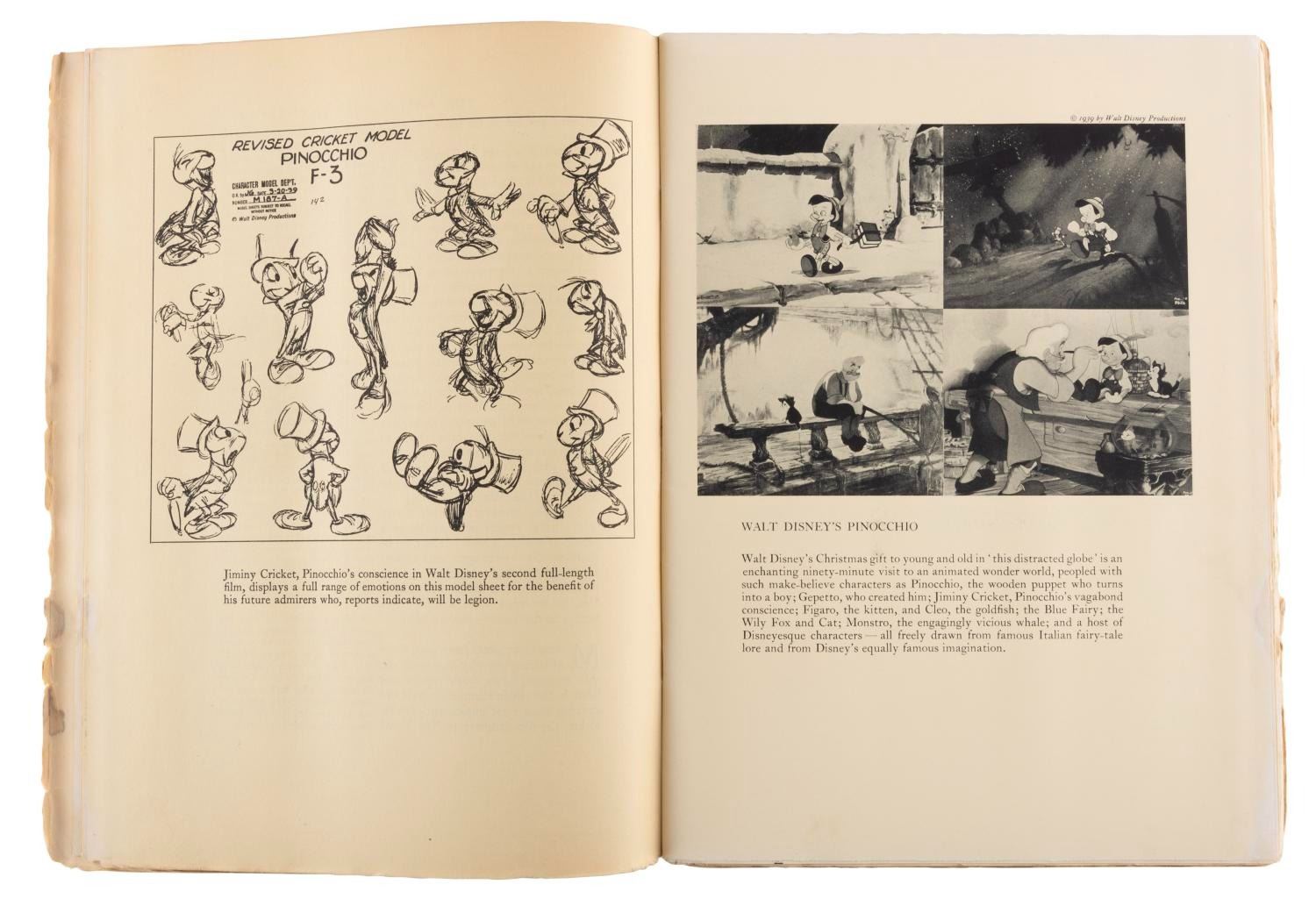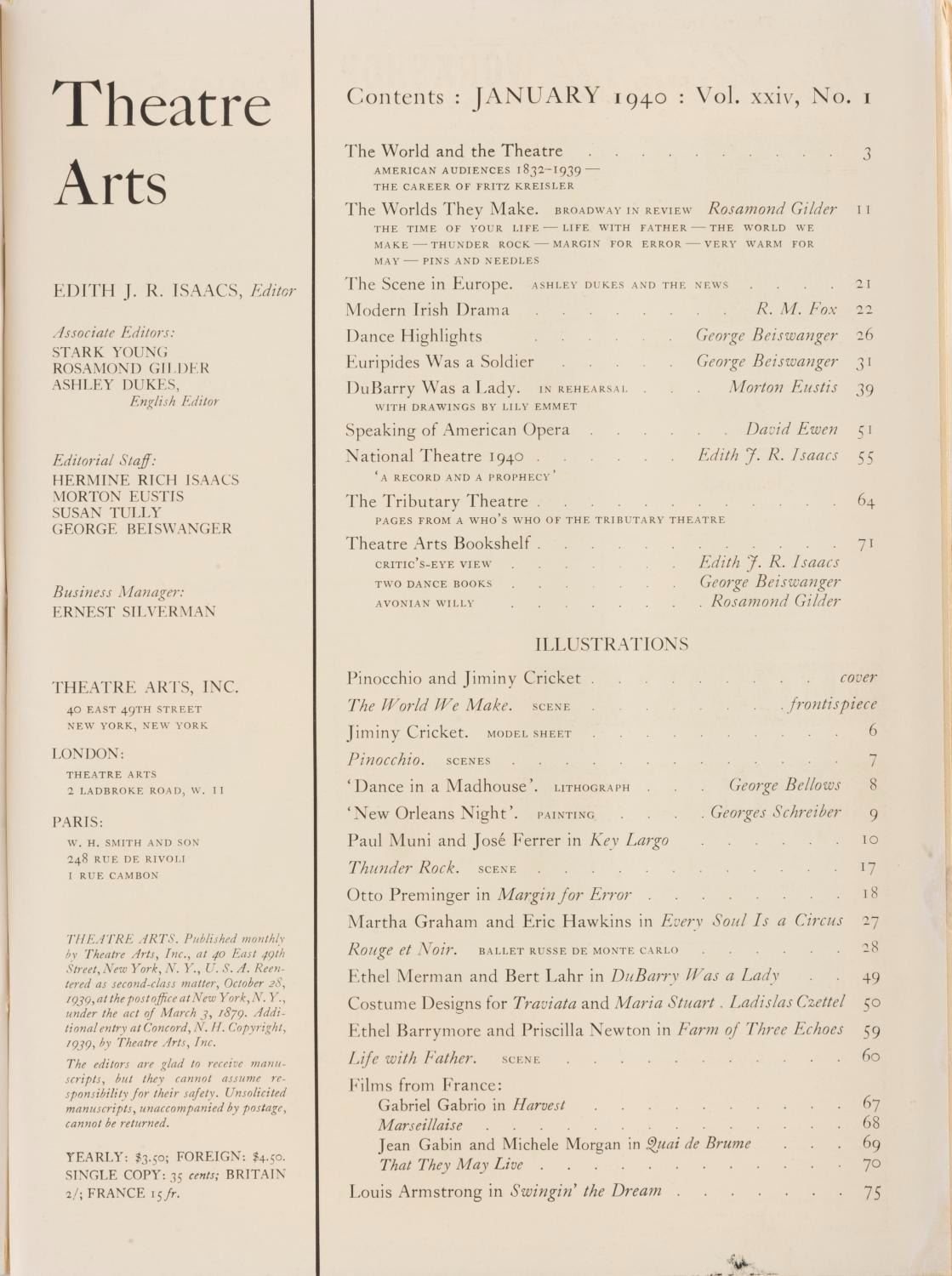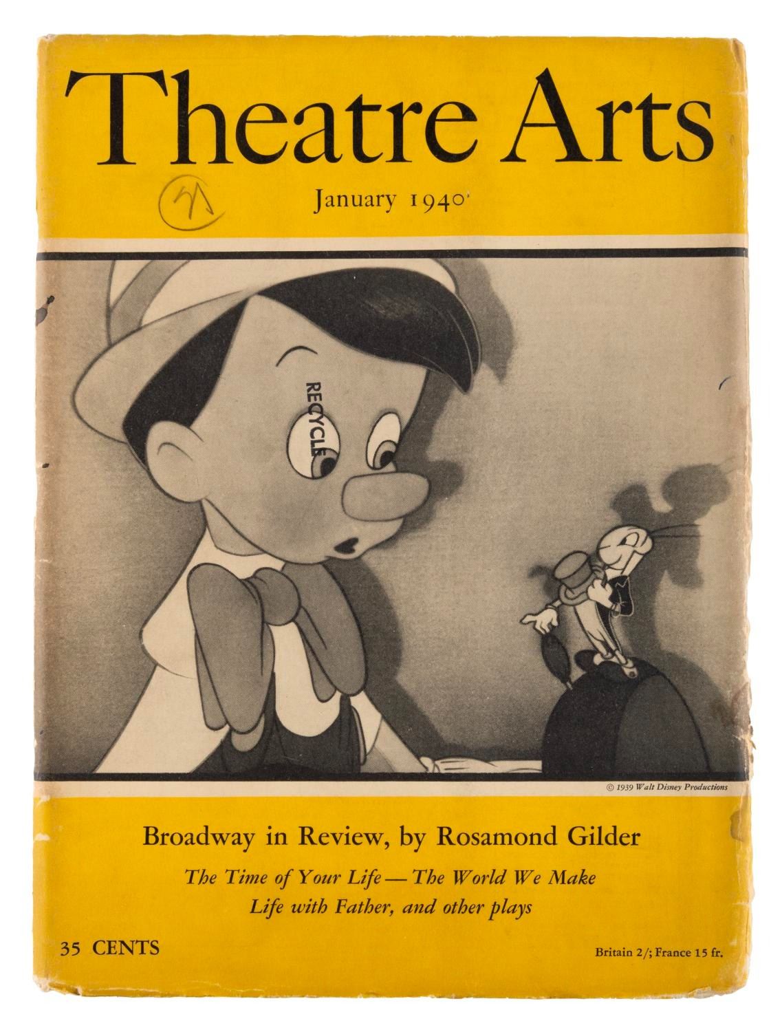 (Disney, 1940) A January 1940 issue of Theatre Arts magazine, with a cover image of Pinocchio. Inside are a few images and a short review of the film. Measuring 8.25" x 11", the magazine is in good condition with a stamp and pencil notation on the cover, and edge wear including creases, chipping, and small stains.