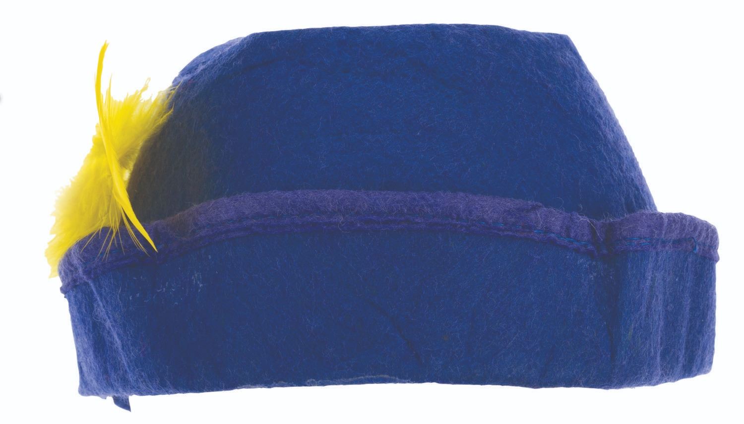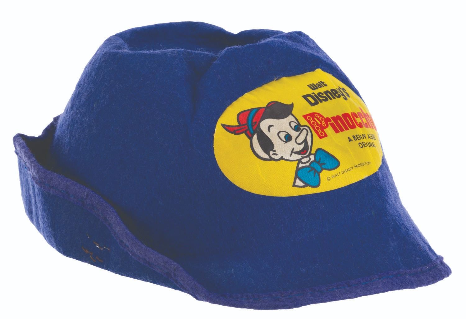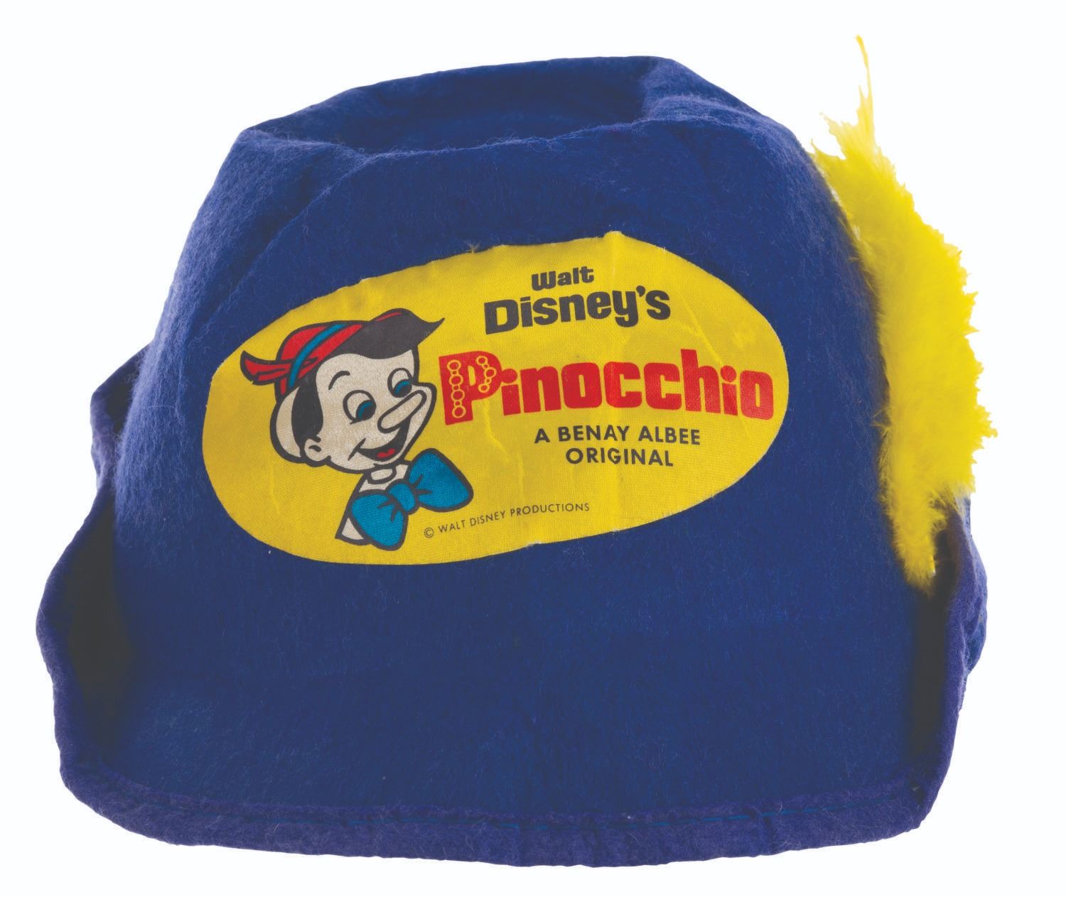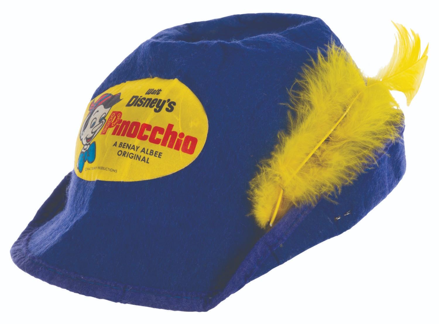 (Benay-Albee, 1960s) A blue “Pinocchio” felt hat with a yellow feather manufactured by Benay-Albee, the same company that made the original Mickey Mouse ear hats. With a 6” x 9” opening, the children's hat is in good condition with creases, oxidation on the staples, wear from use and discoloration from age.