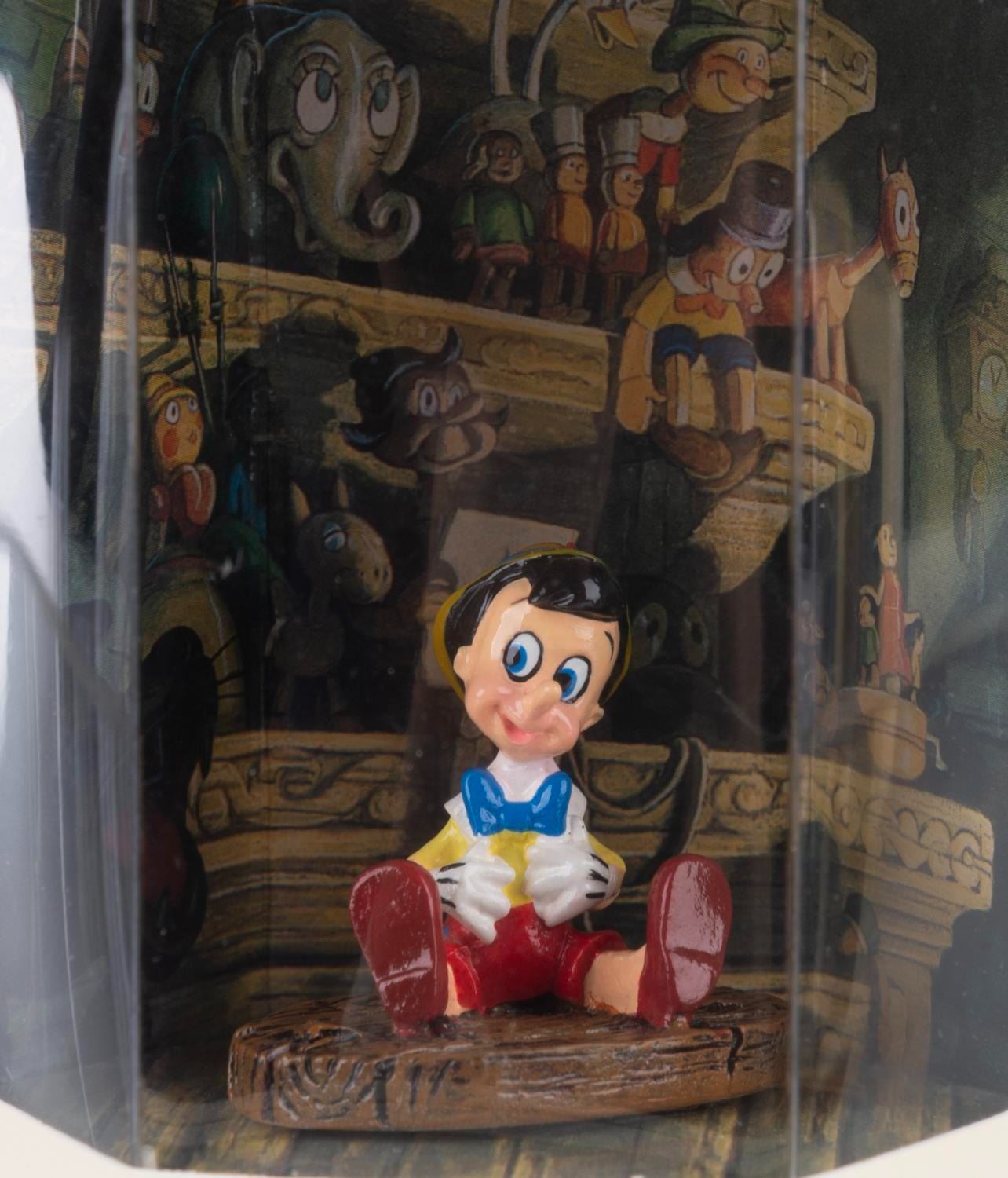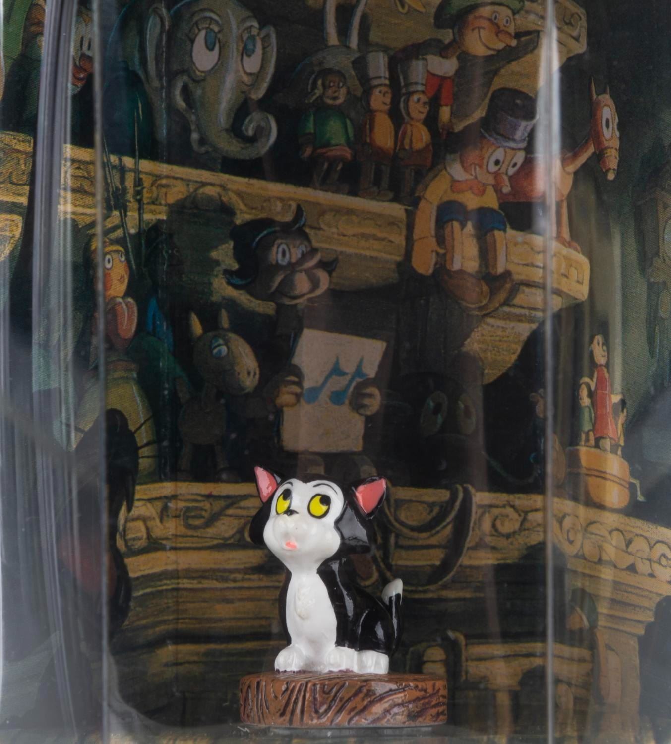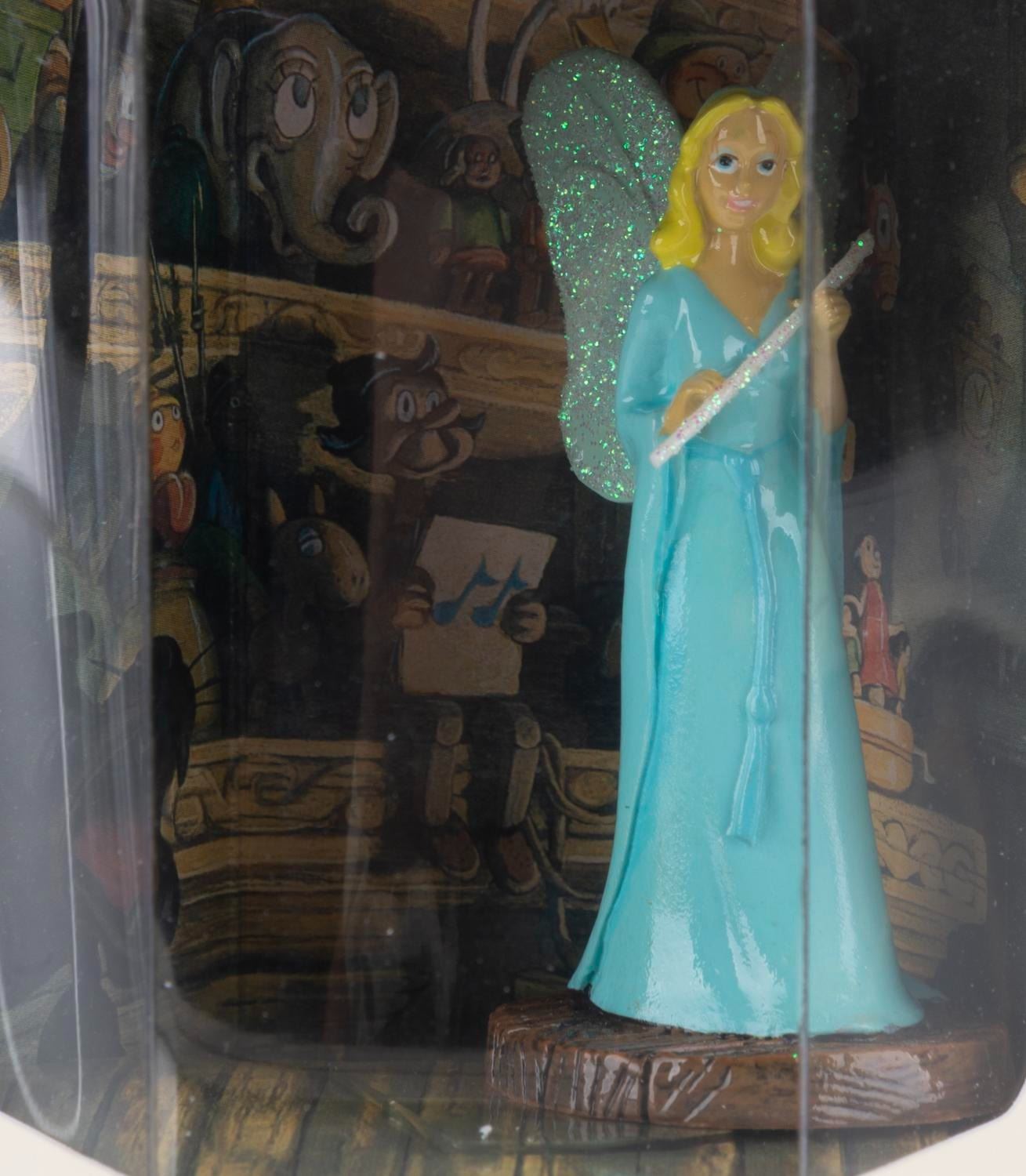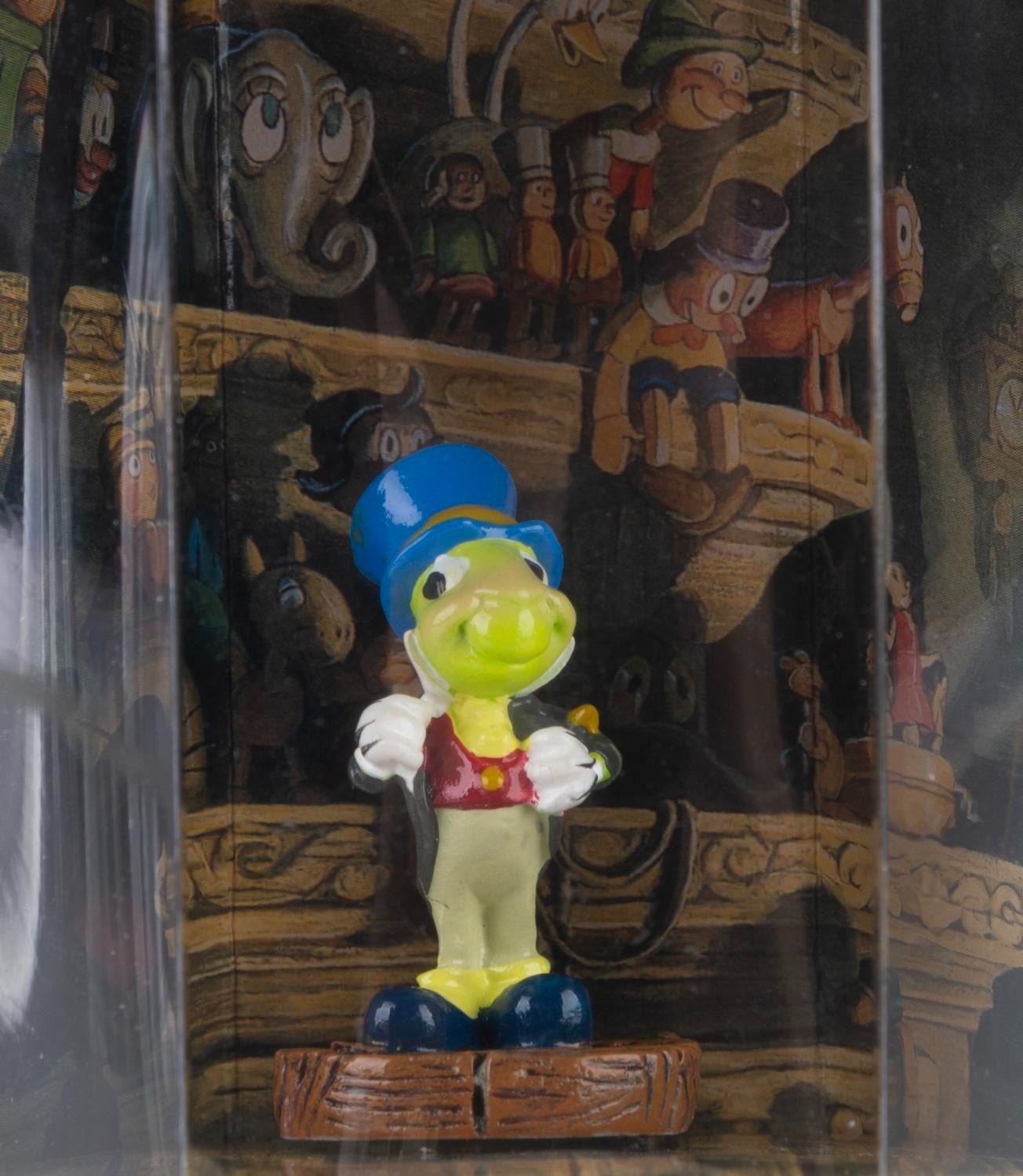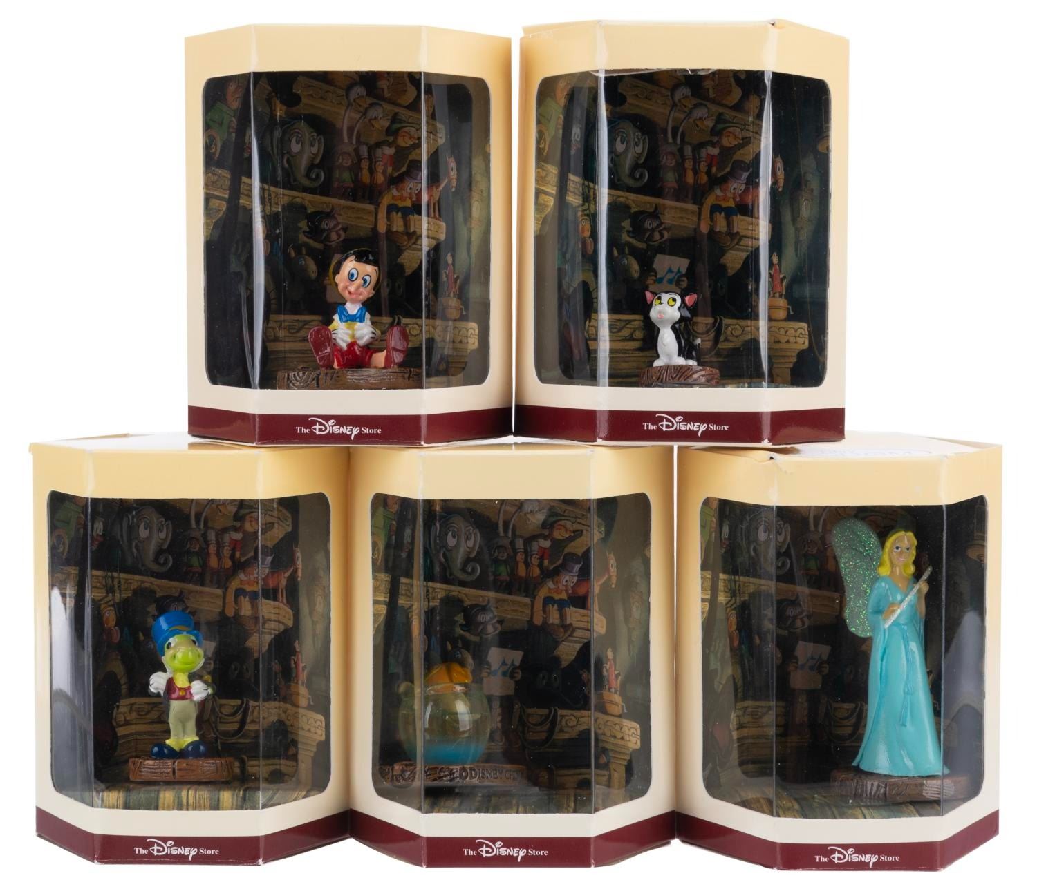 (Disney Store, 1990s) A collection of five"Pinocchio" Tiny Kingdom figurines in their original boxes, including Cleo, Figaro, the Blue Fairy, Jiminy Cricket, and Pinocchio. Measuring 3" x 3" x 3.5" in the box, the figures are in fine condition.