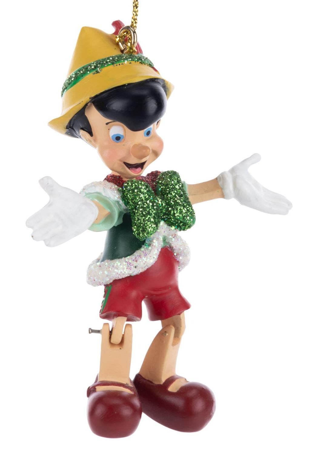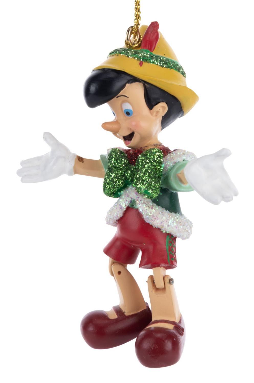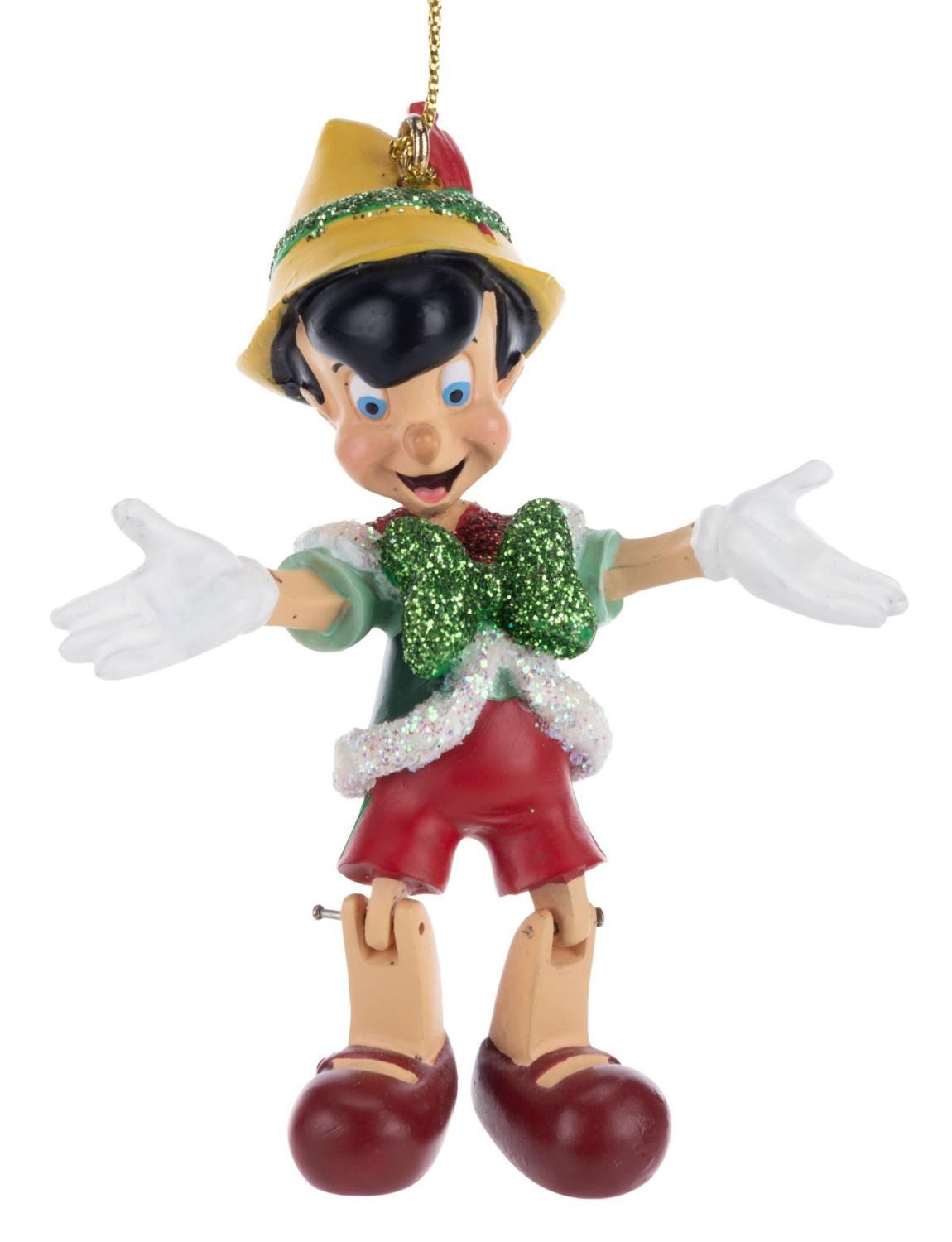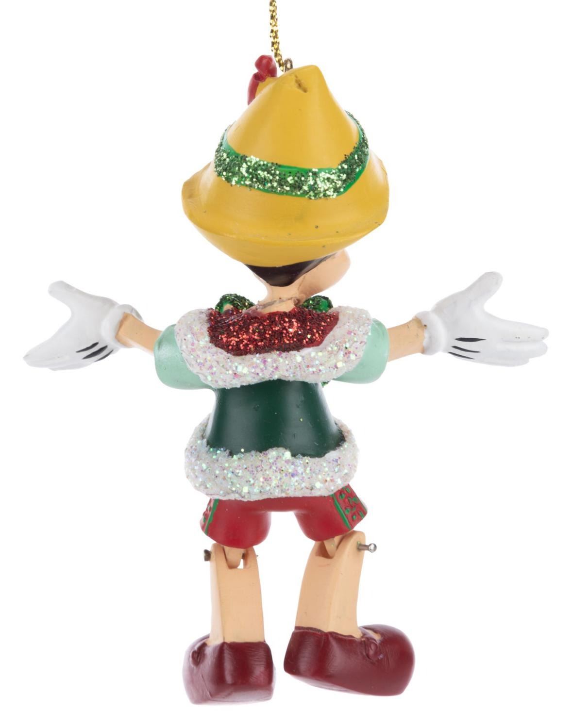 (Disney, 2000s) A “Pinocchio” Christmas tree ornament featuring the wooden boy in a glittery festive outfit. Measuring 3.5” tall, the ornament displays in very good condition with visible repairs on the neck, paint chipping on the right arm, and a scuff on the hat. Its original tags are still attached.