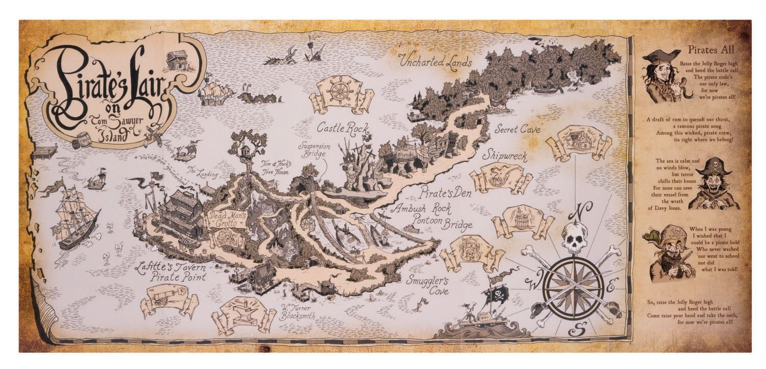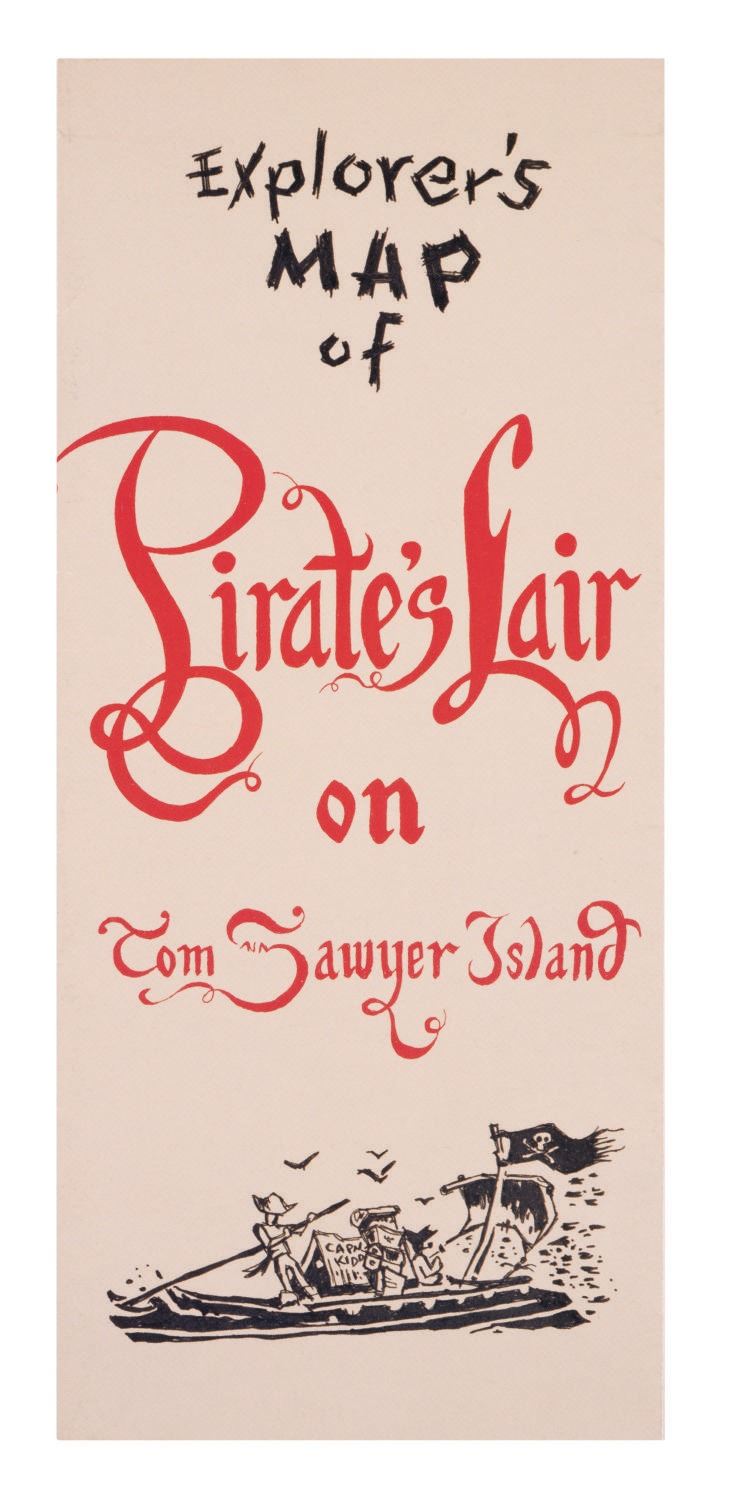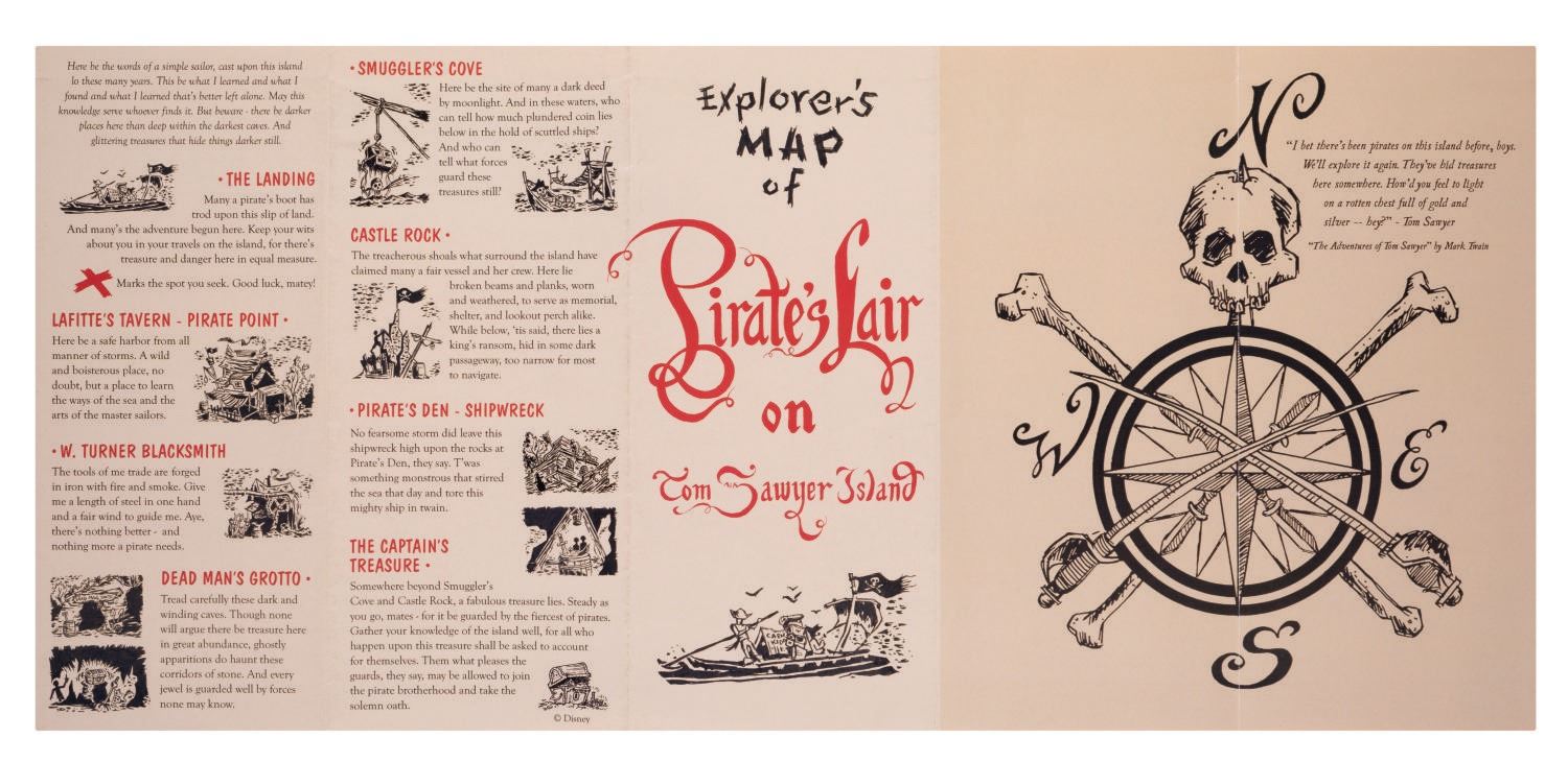 Disneyland, 2000s) A souvenir explorer's map of "Pirate's Lair on Tom Sawyer Island." The map folds out, with a stylish rendition of the island and information about the new Pirates of the Caribbean-inspired adventures at Pirate's Lair. Measuring 19.75"x9" while opened, the map is in very good condition with light wear from handling.