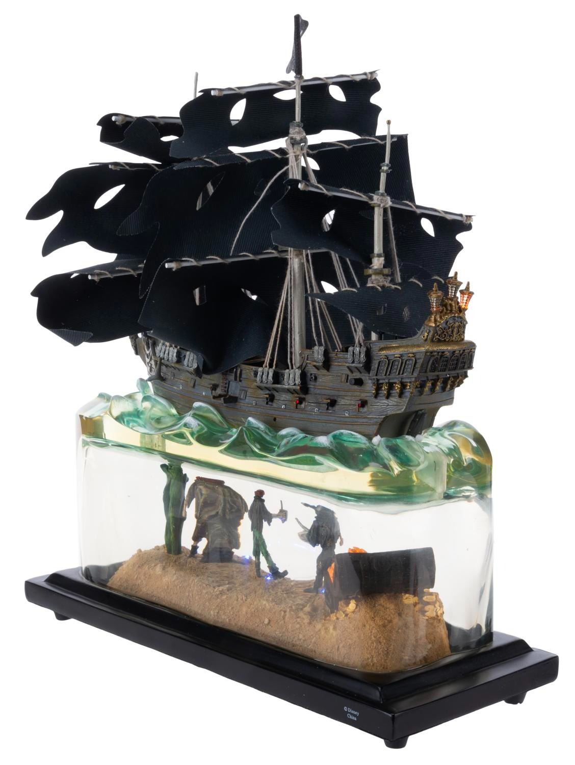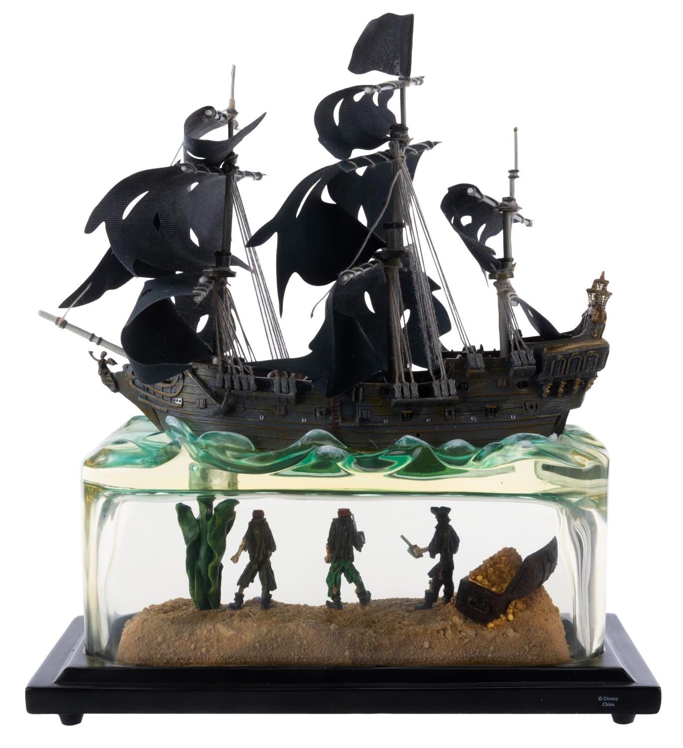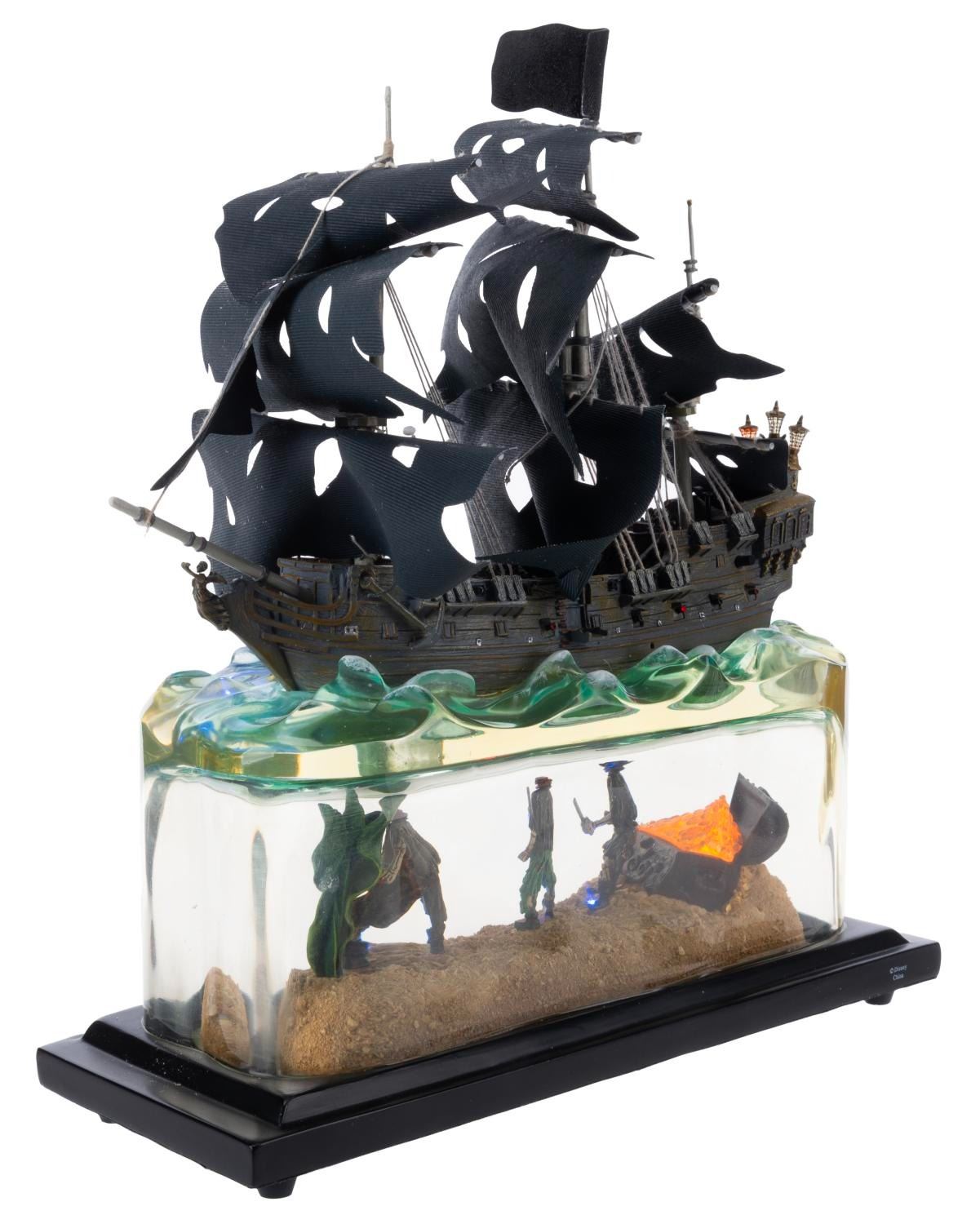 (Disneyland, 2006) A Pirates of the Caribbean figurine of the cursed ship, The Black Pearl, with skeletal pirates walking the ocean's depths below. This piece was produced in resin and glass in a limited edition of 300 exclusively for the"A Moonlit Voyage" event held at Disneyland on July 6, 2006. With two AA batteries (not included), the stern lanterns glow and cannon ports flash red, while a ghostly voice intones"Dead Men Tell No Tales." Measuring 11.75" x 10.25" x 4" deep, the figurine is in fine condition, working when tested. It comes with its original box.