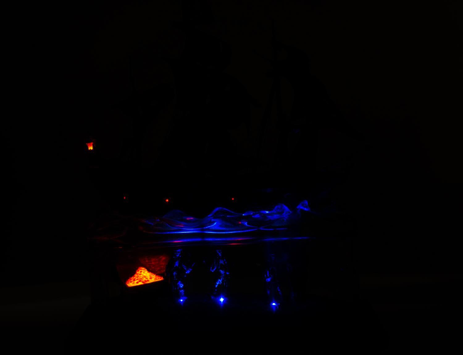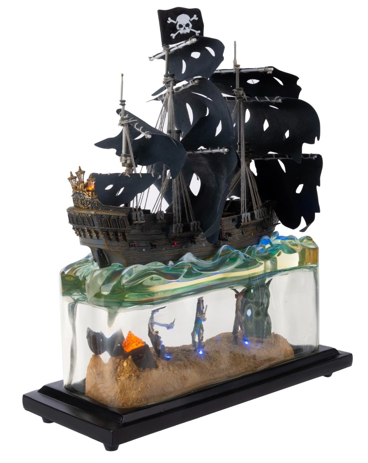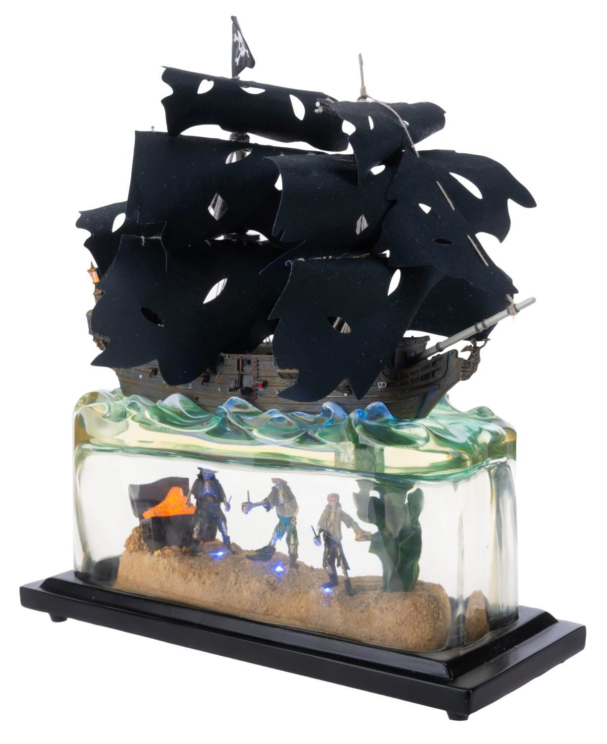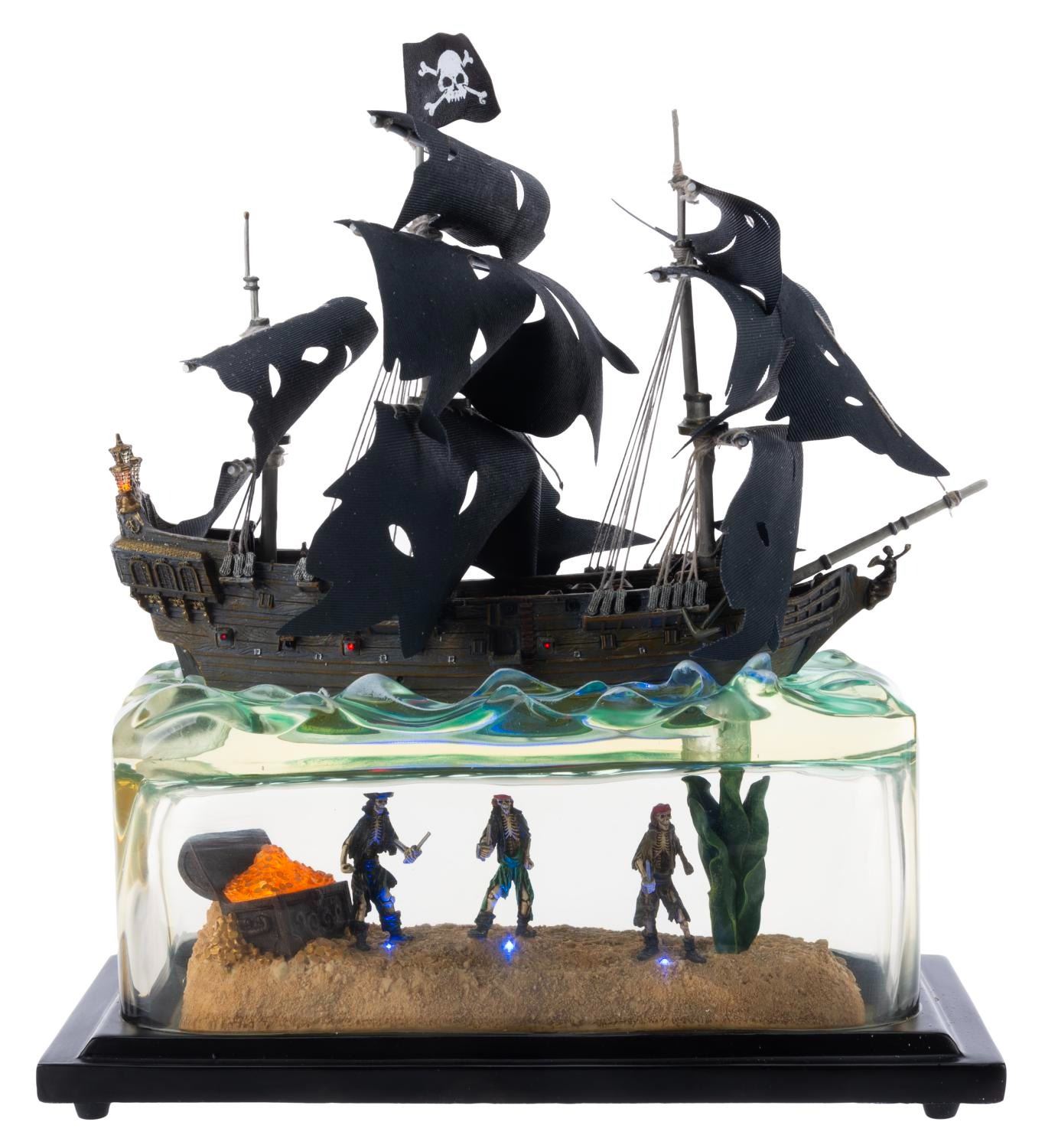 (Disneyland, 2006) A Pirates of the Caribbean figurine of the cursed ship, The Black Pearl, with skeletal pirates walking the ocean's depths below. This piece was produced in resin and glass in a limited edition of 300 exclusively for the"A Moonlit Voyage" event held at Disneyland on July 6, 2006. With two AA batteries (not included), the stern lanterns glow and cannon ports flash red, while a ghostly voice intones"Dead Men Tell No Tales." Measuring 11.75" x 10.25" x 4" deep, the figurine is in fine condition, working when tested. It comes with its original box.