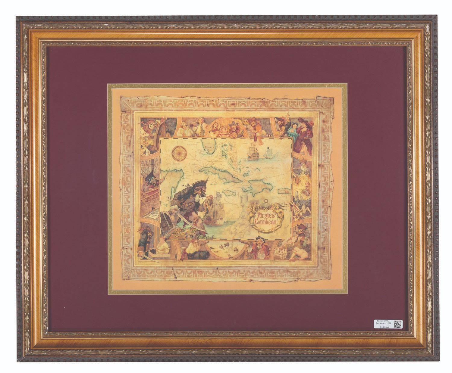 (Disneyland, 1992) A print of a stylized map by Imagineer John Horny for Pirates of the Caribbean at Euro Disneyland. Horny's original artwork was created in 1987, and this wonderful reproduction of the map was offered at the Disney Gallery in 1992. The artwork has an image size of 12.5" x 11" within the 23" x 19" frame and mat. The print is in fine condition and the frame very good condition with several slight chips at the edges.