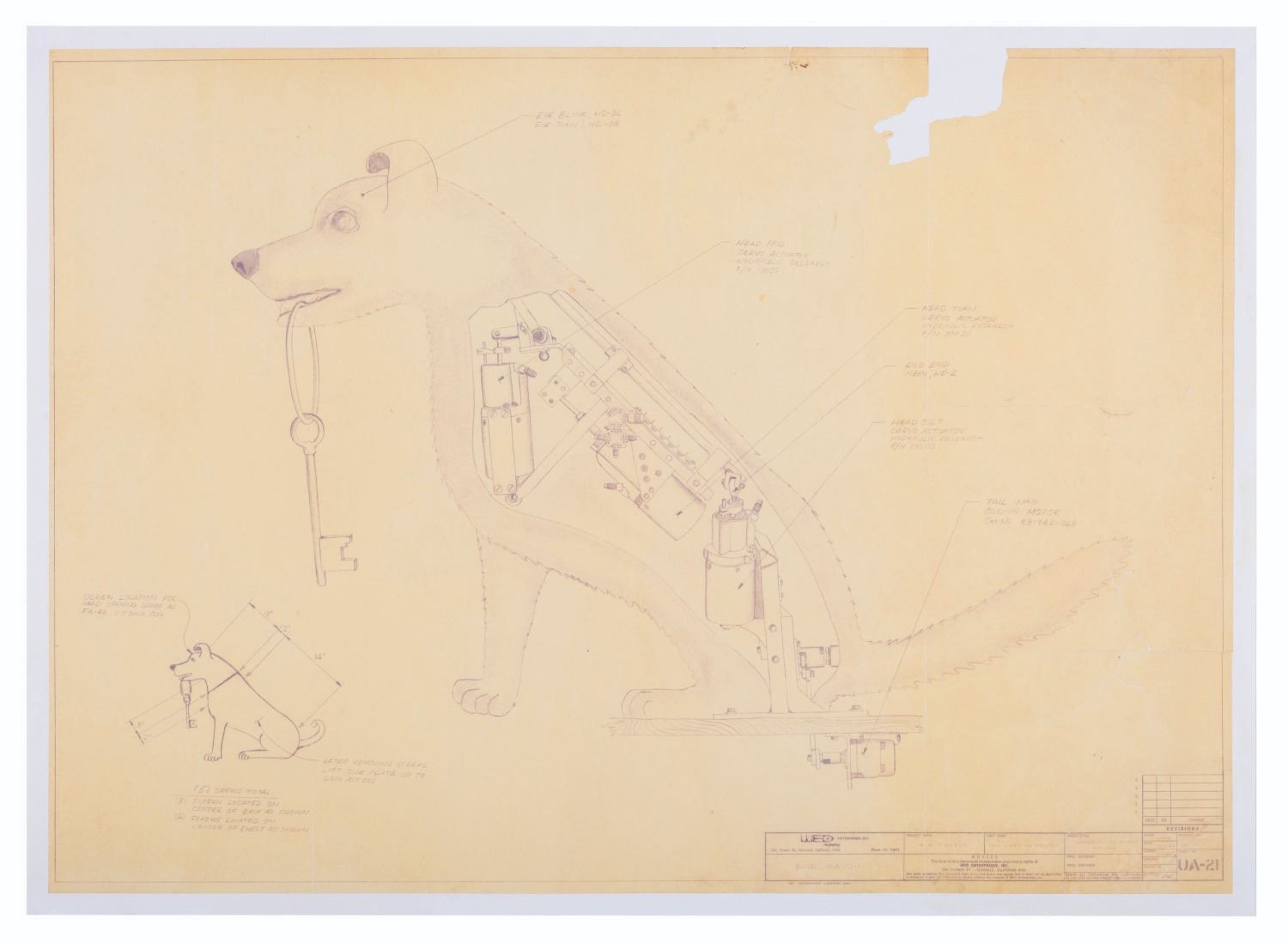 (Disneyland, 1966) A WED Enterprises blueprint for the Audio-Animatronic key-holding dog from Pirates of the Caribbean. This famous mutt appears late in the ride, as jailed pirates coax it to give them the keys to their cell—an iconic scene conceived by Imagineer Marc Davis and recreated in the film “Pirates of the Caribbean: The Curse of the Black Pearl.” Drawn by D.V. Kuchta and dated 10-12-66, the blueprint depicts the animatronic dog’s inner workings including its eye blink, head nod, and tail wag. Measuring 30” x 42.75” and 31.5” x 44.5” linen-backed for preservation, the blueprint is in good condition with stains, color loss, and heavy tears and repair work throughout, including a 4” x 4.75” torn-off section near the top right.