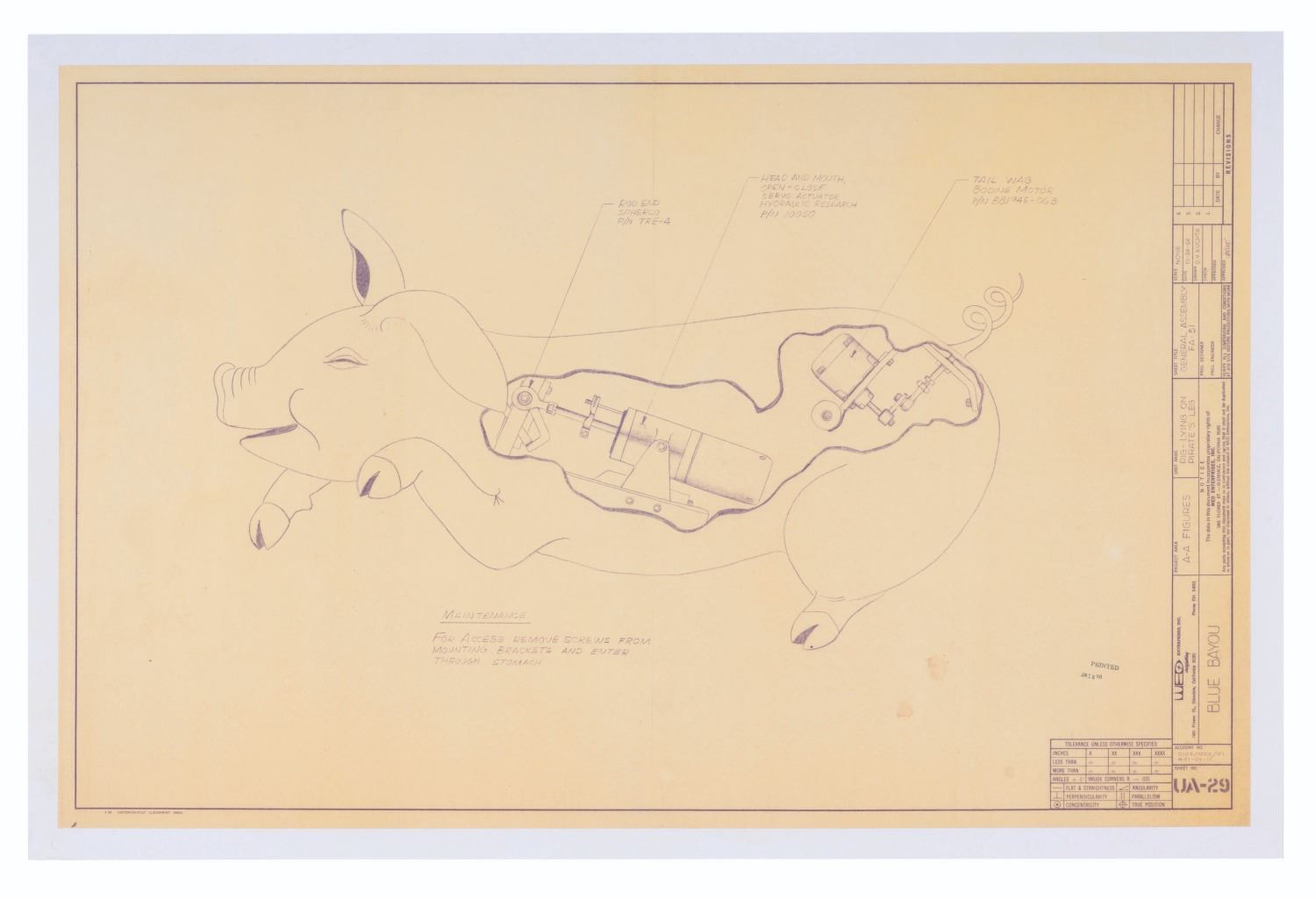 (Disneyland, 1966-1968) A WED Enterprises blueprint for the Audio-Animatronic pig laying on a pirate’s leg in Pirates of the Caribbean. The pig blueprint, showing the animatronics inner workings from its opening mouth to its wagging tail, was drawn by D.V. Kuchta on October 24, 1966, and printed on January 18, 1968. “Blue Bayou” is written on the side, as Blue Bayou Lagoon was the original working name for Pirates of the Caribbean. Measuring 22” x 34.25” and 23.75” x 36” linen-backed for preservation, the blueprint is in very good condition with a vertical and horizontal fold from storage, patches of color loss, and scuffs from use.