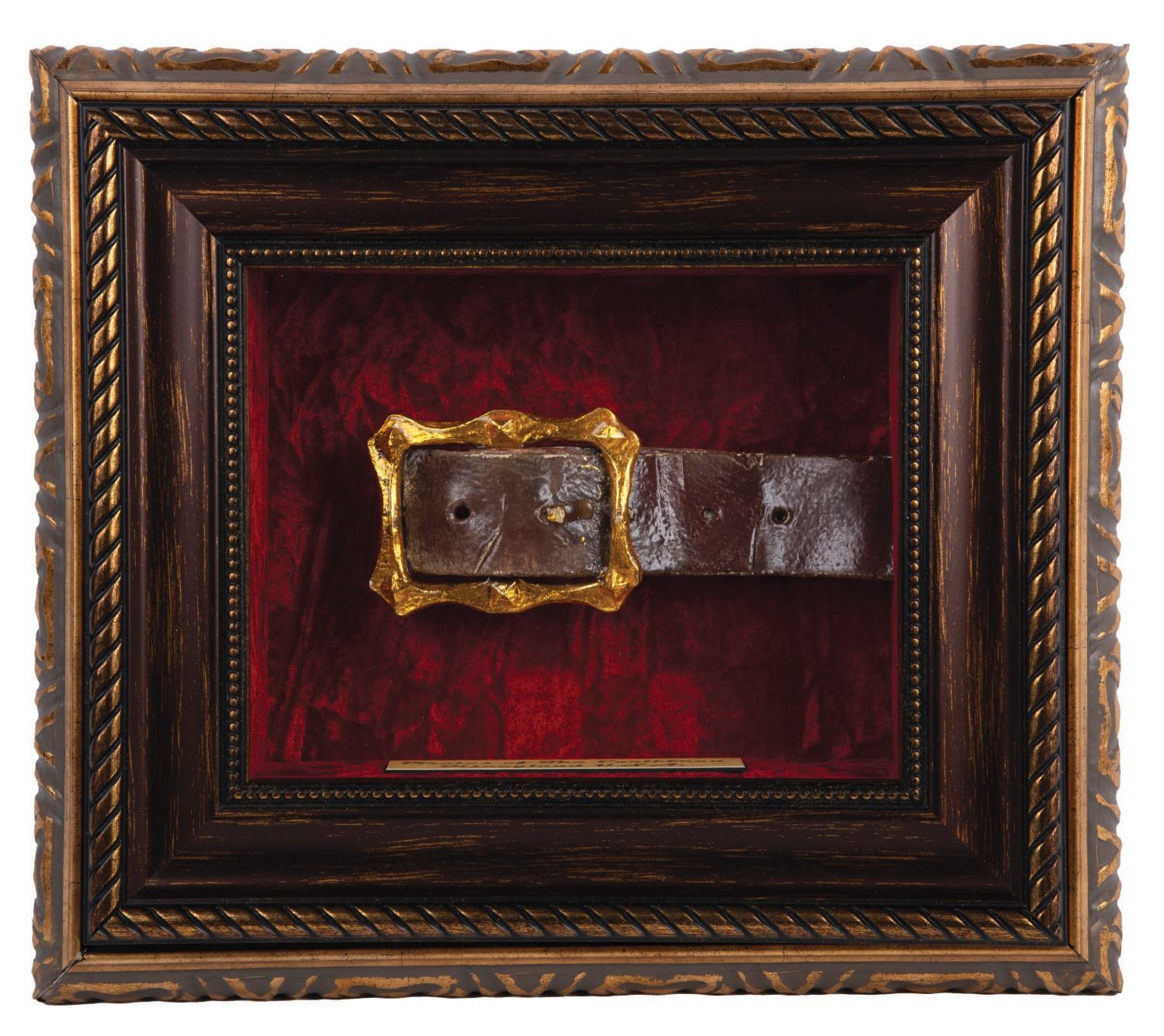 (Disneyland, 2000s) A belt and buckle prop from a Pirates of the Caribbean Audio-Animatronics figure at Disneyland. The prop is of the style worn by many Audio-Animatronics pirates including (most recently) The Redhead Pirate and was removed during a rehabilitation. Approximately 3.5"x8" of the prop is visible, mounted for display within a shadow box measuring 14"x16" and 3.5" deep. The entire piece displays in very good condition, exhibiting wear from Park use.
