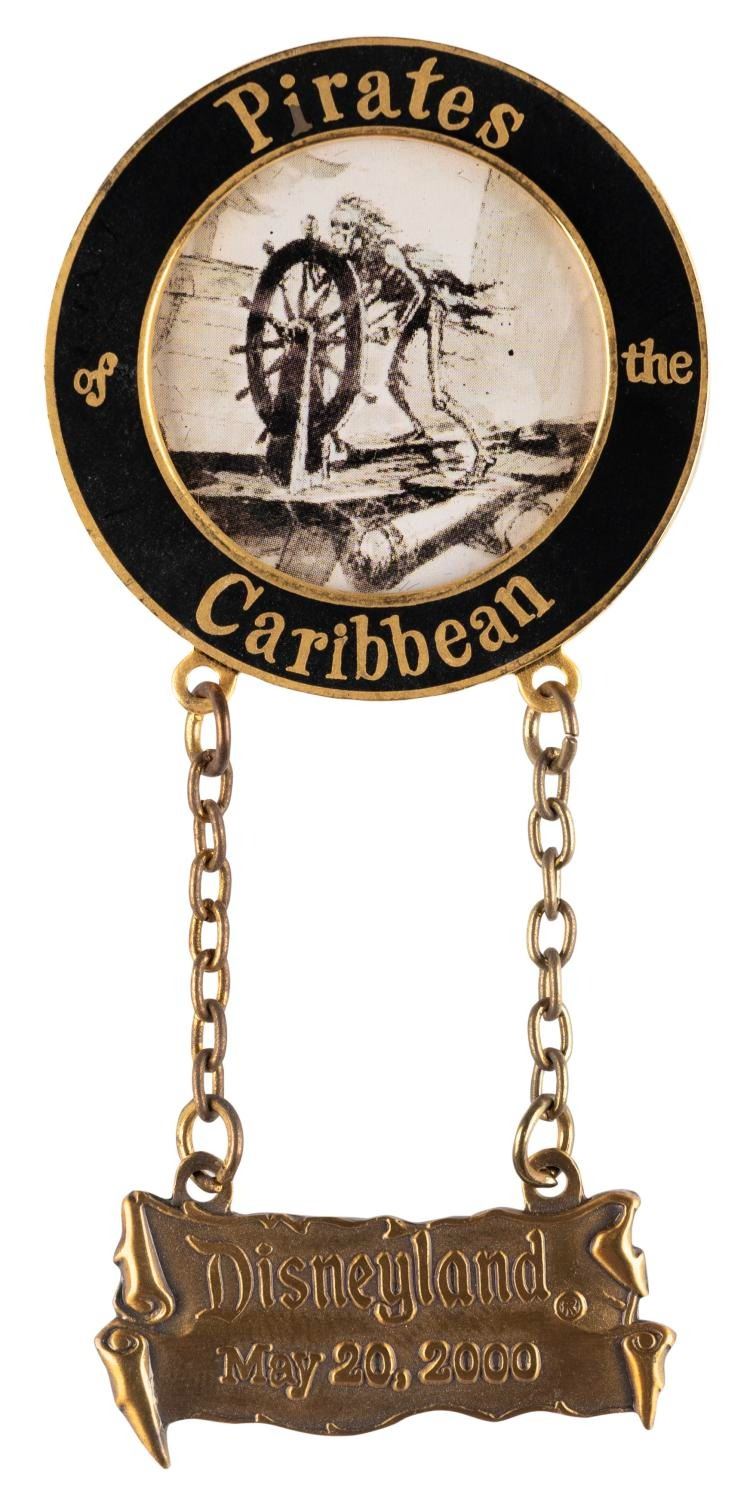 (Disneyland, 2000) A Pirates of the Caribbean pin from a special merchandise event on May 20, 2000, featuring Disney Legend Marc Davis' concept art of a skeleton helmsman. Measuring 3.5” tall, the pin is in very good condition with light wear.