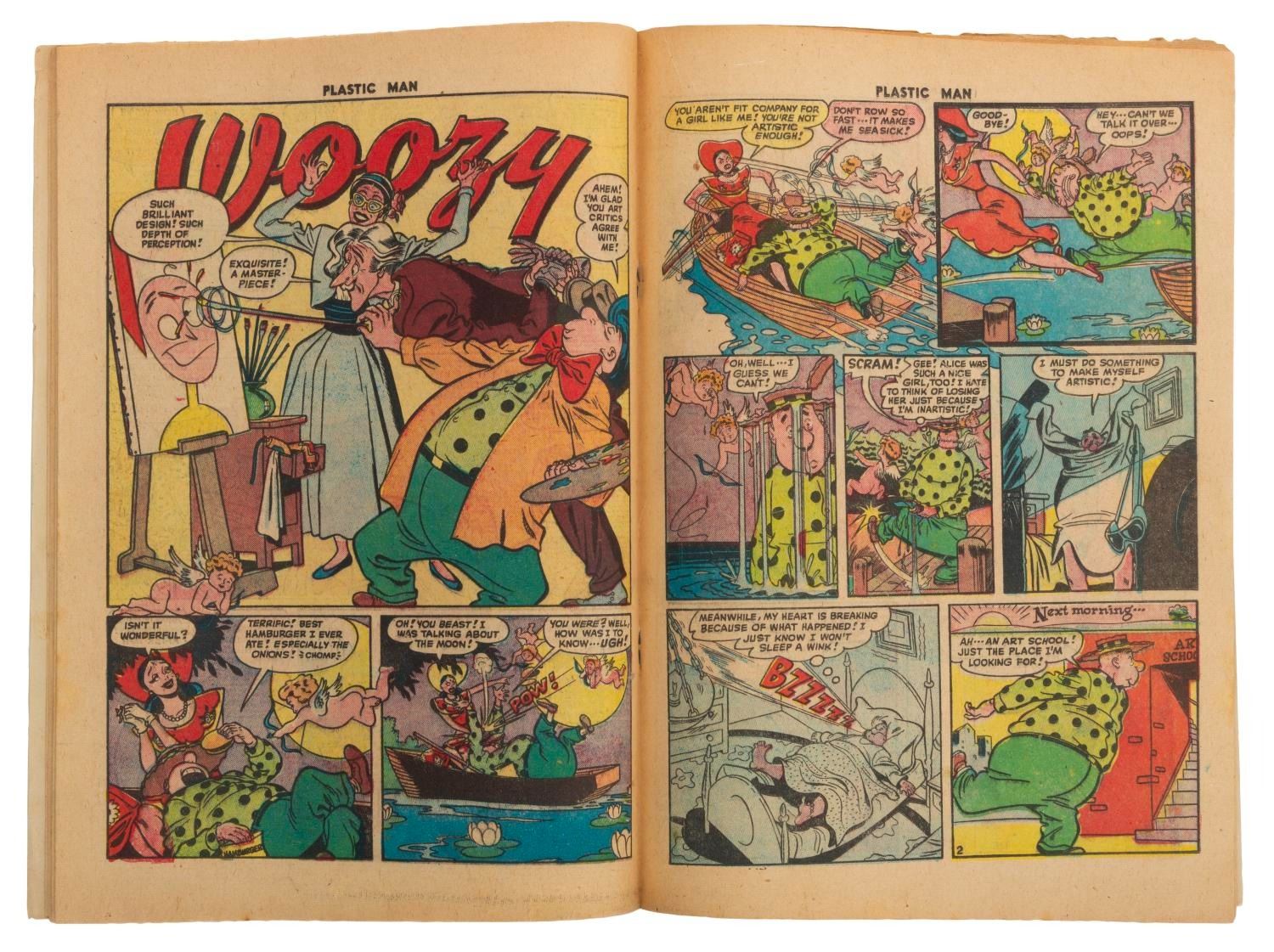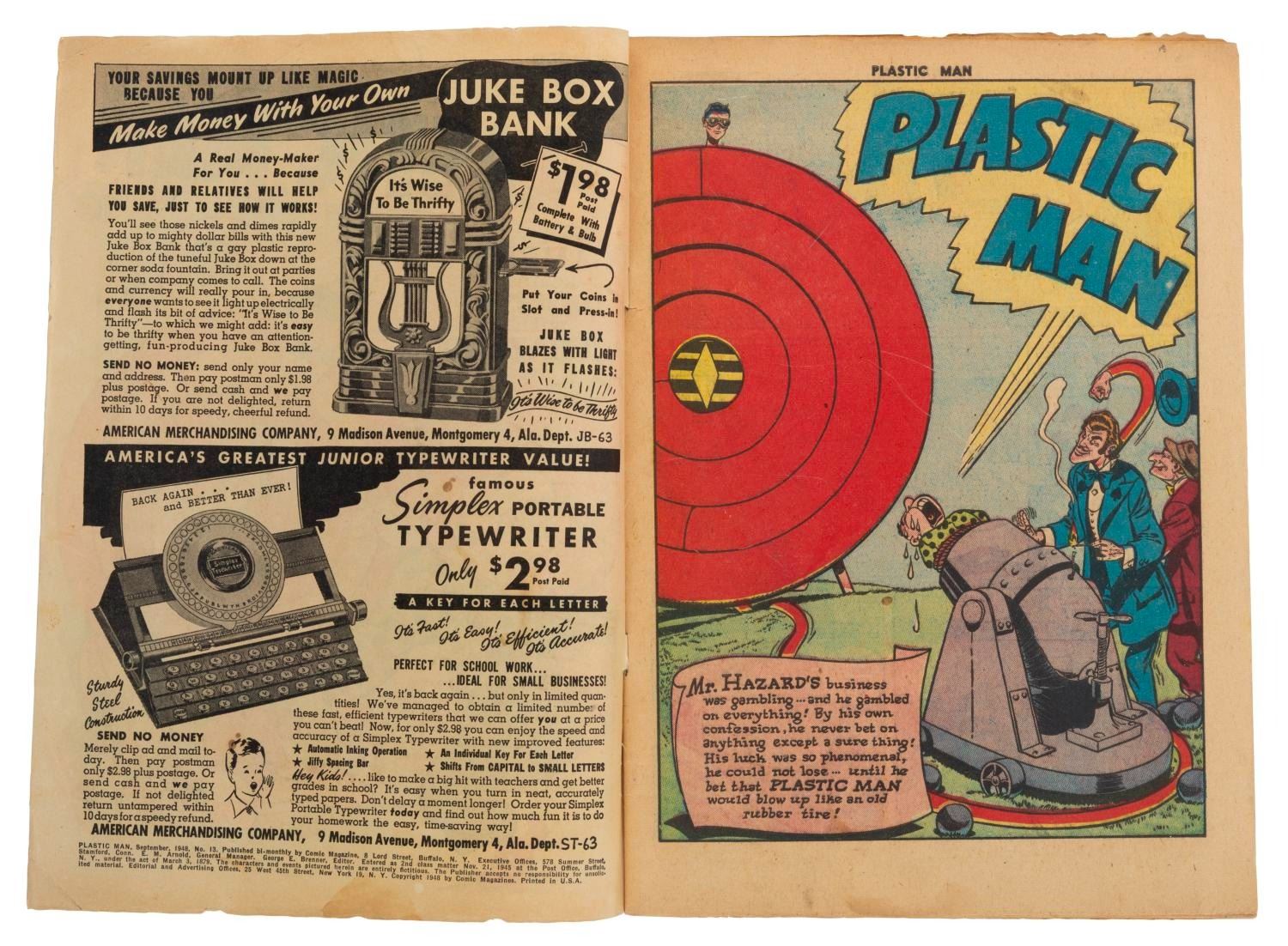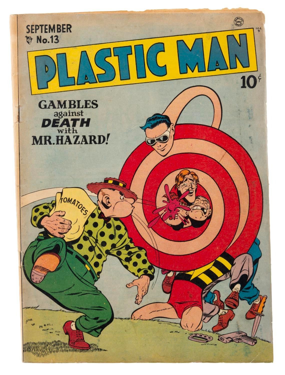(Quality Comics, 1948) Issue #13 of Plastic Man "Gambles Against Death with Mr. Hazard." Measuring 7.5" x 10.25", the comic book is in good condition with light edge wear, discoloration, slight splitting around the staples, soiling, and staining.
